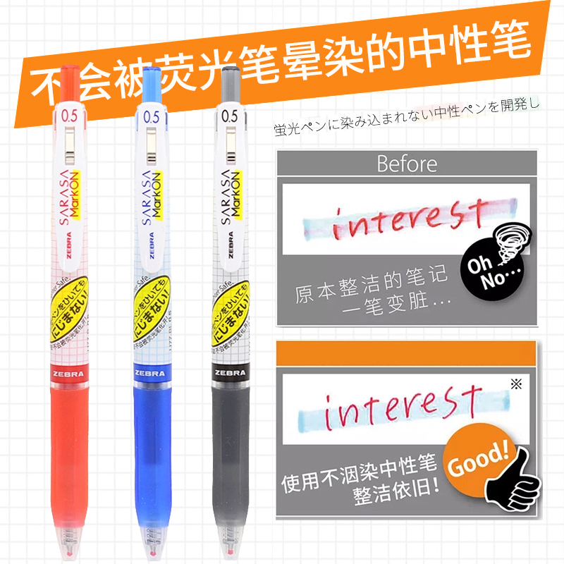 日本zebra斑马中性笔JJ77荧光不晕染速干黑笔0.5笔芯黑色按动式学生用考试刷题笔0.4红笔jj15限定格子水性笔