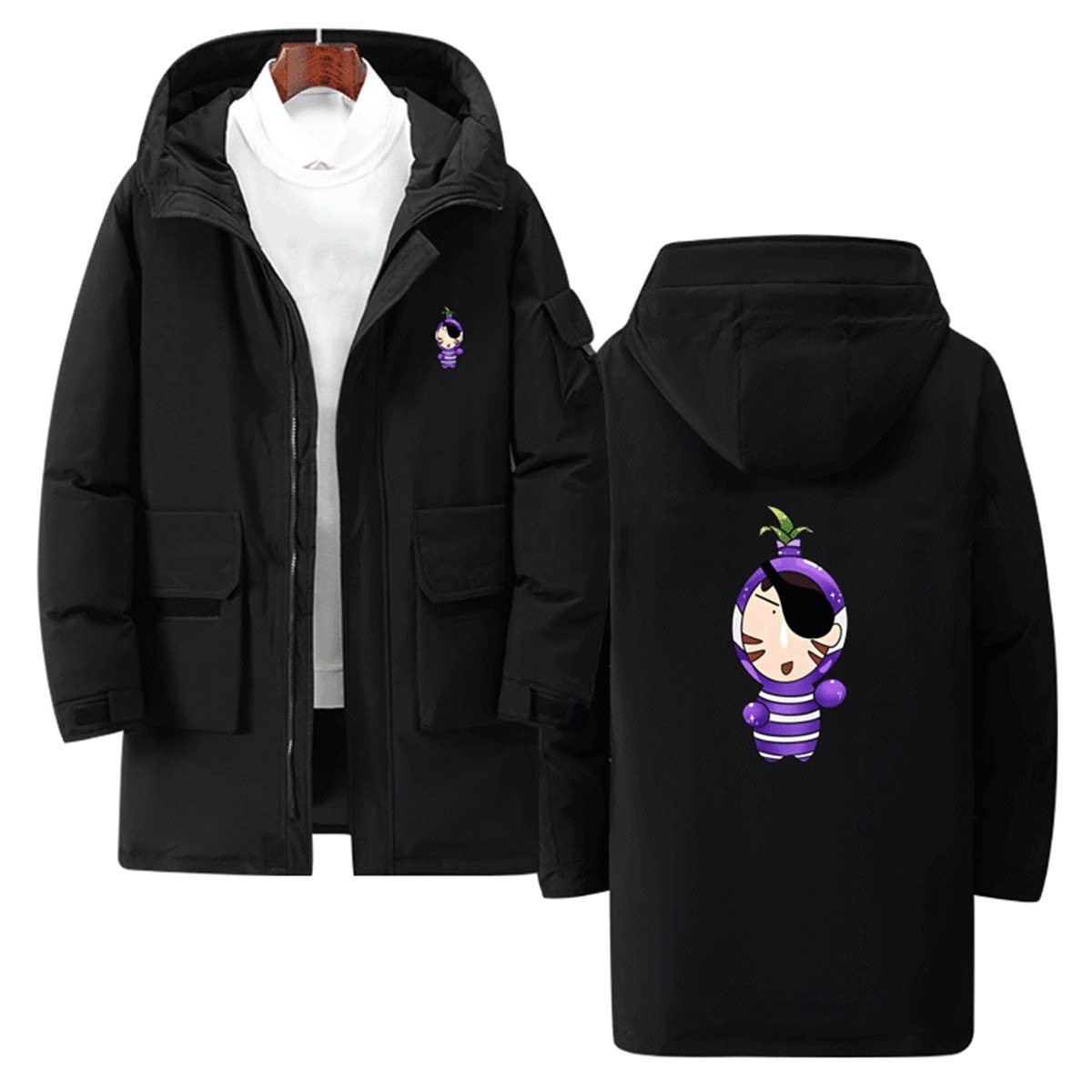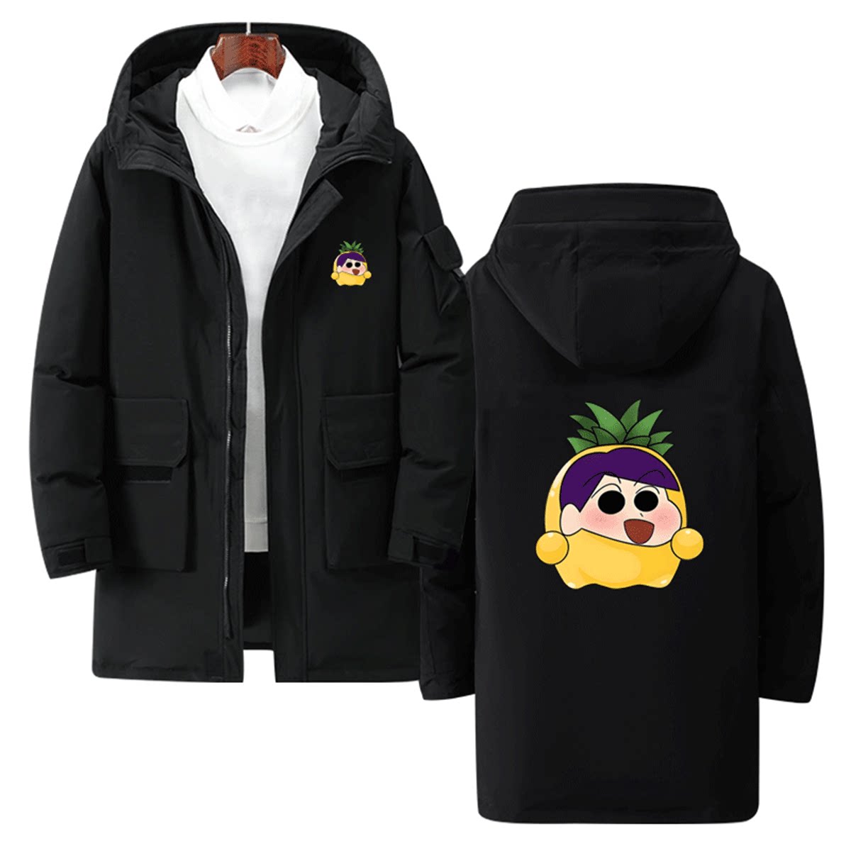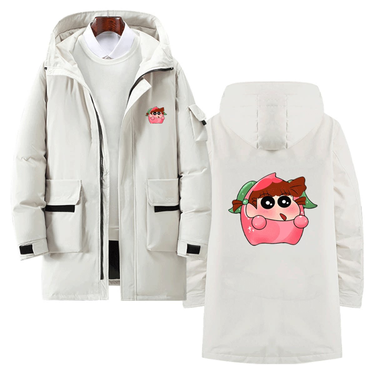 蜡笔小新联名果宝特攻周边男女青少年情侣可定制连帽中长款羽绒服