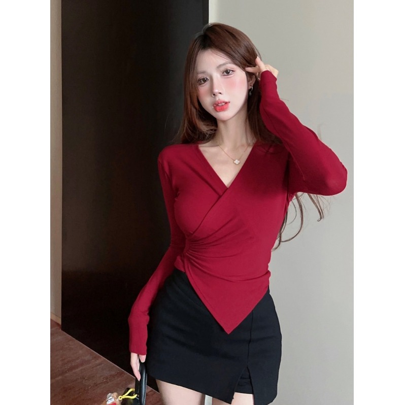 秋季设计感V领长袖T恤打底小衫女内搭收腰绑带不规则辣妹短款上衣