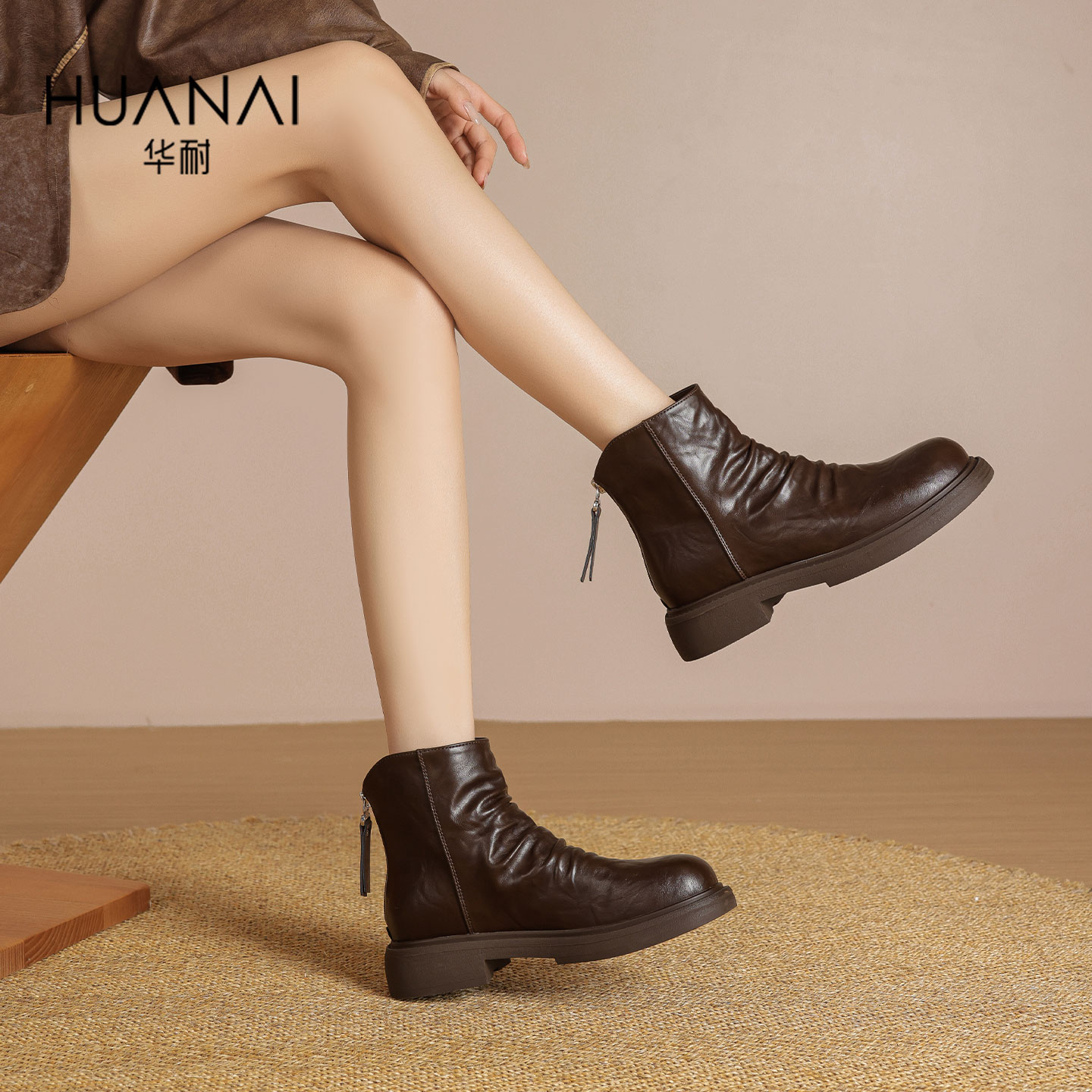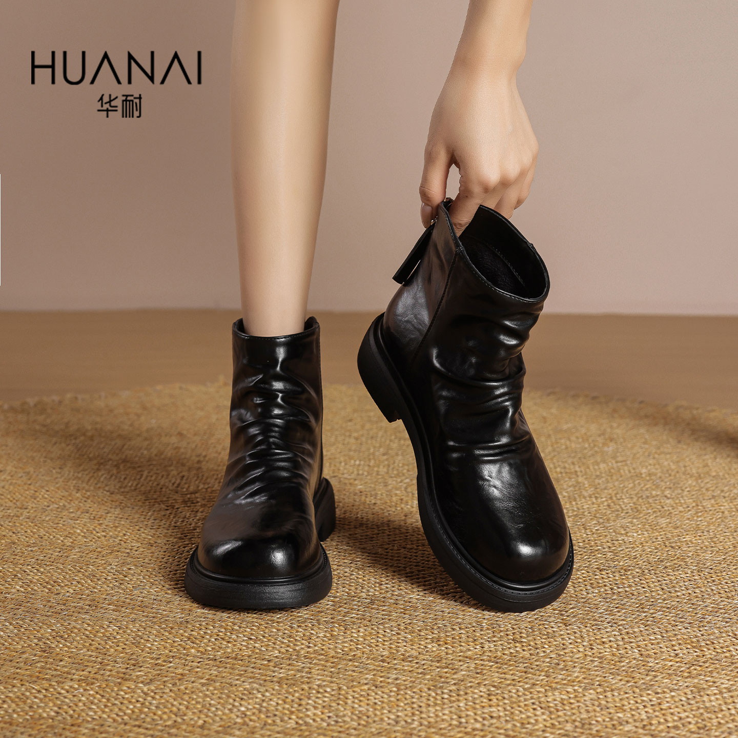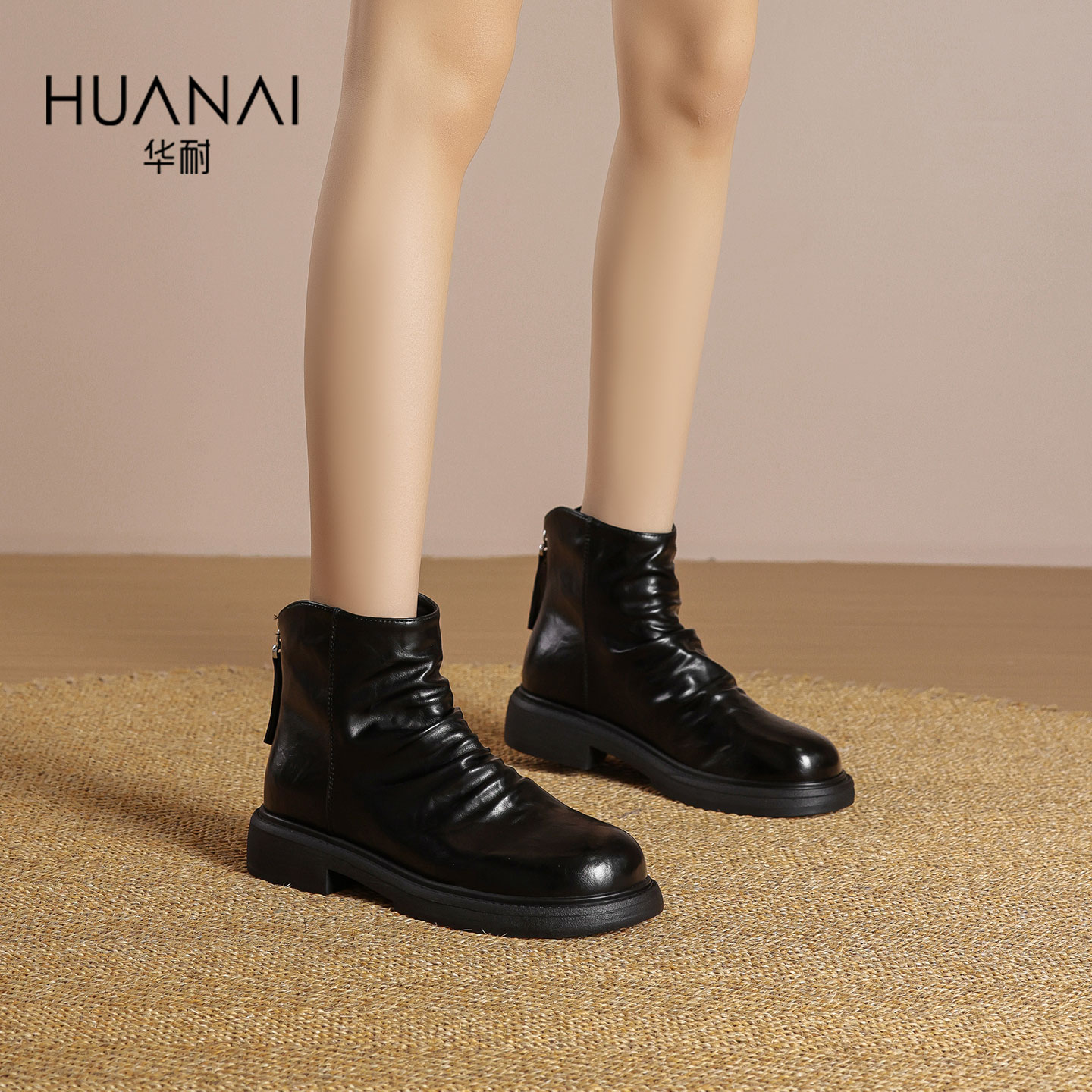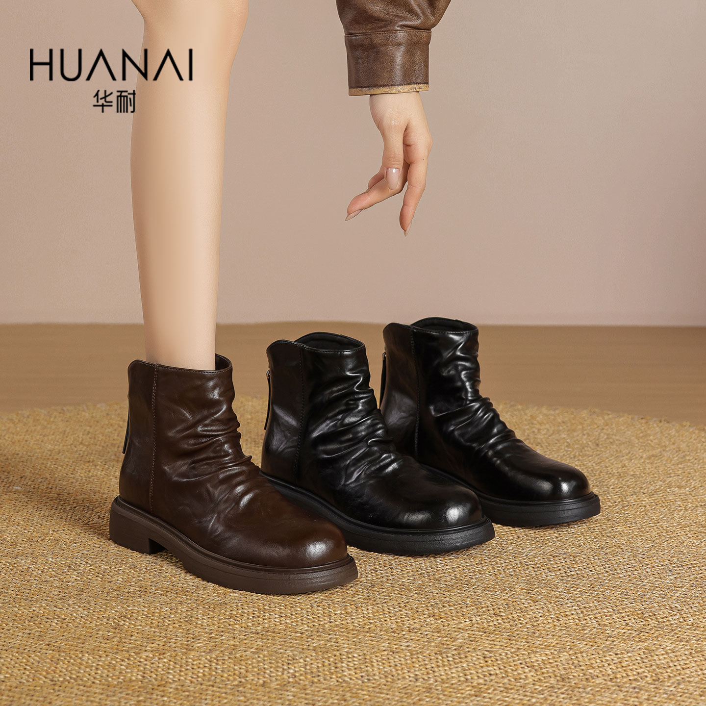 华耐2025秋冬新款褶皱瘦瘦靴女粗跟英伦风切尔西短靴百搭时装靴子