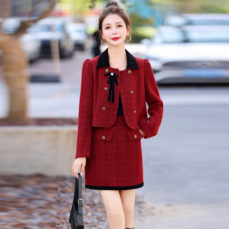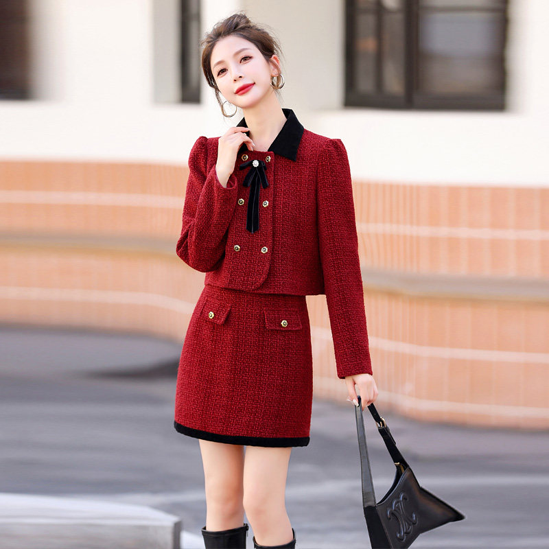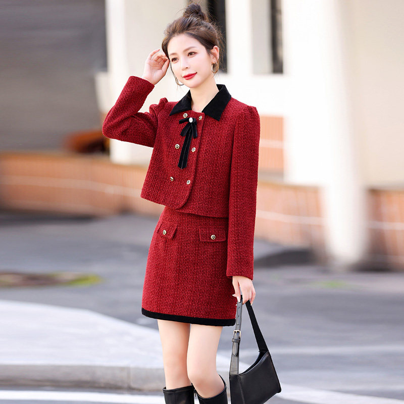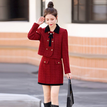 小香风毛呢连衣裙搭配一整套装女2024秋冬新款红色订婚礼服两件套