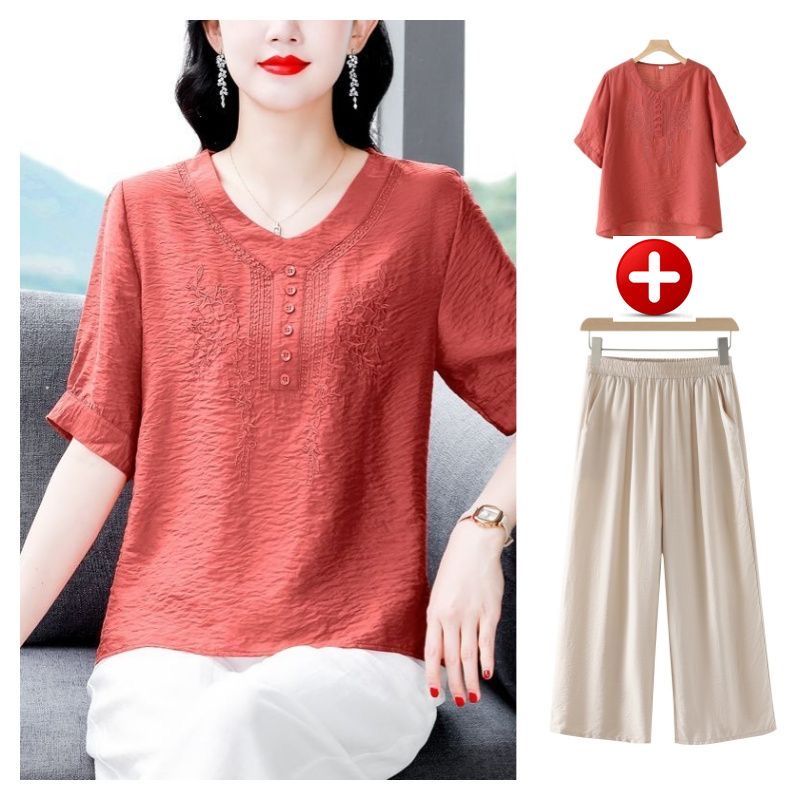 大码中老年妈妈套装女300斤大码刺绣夏季新款时尚宽松短袖两件套