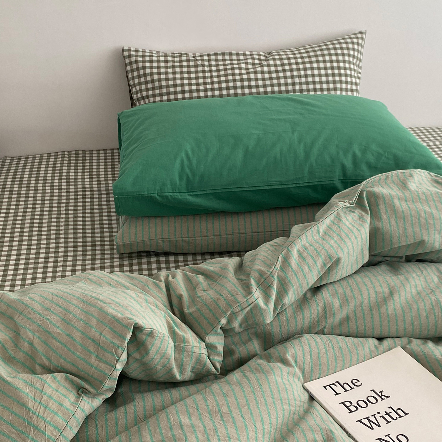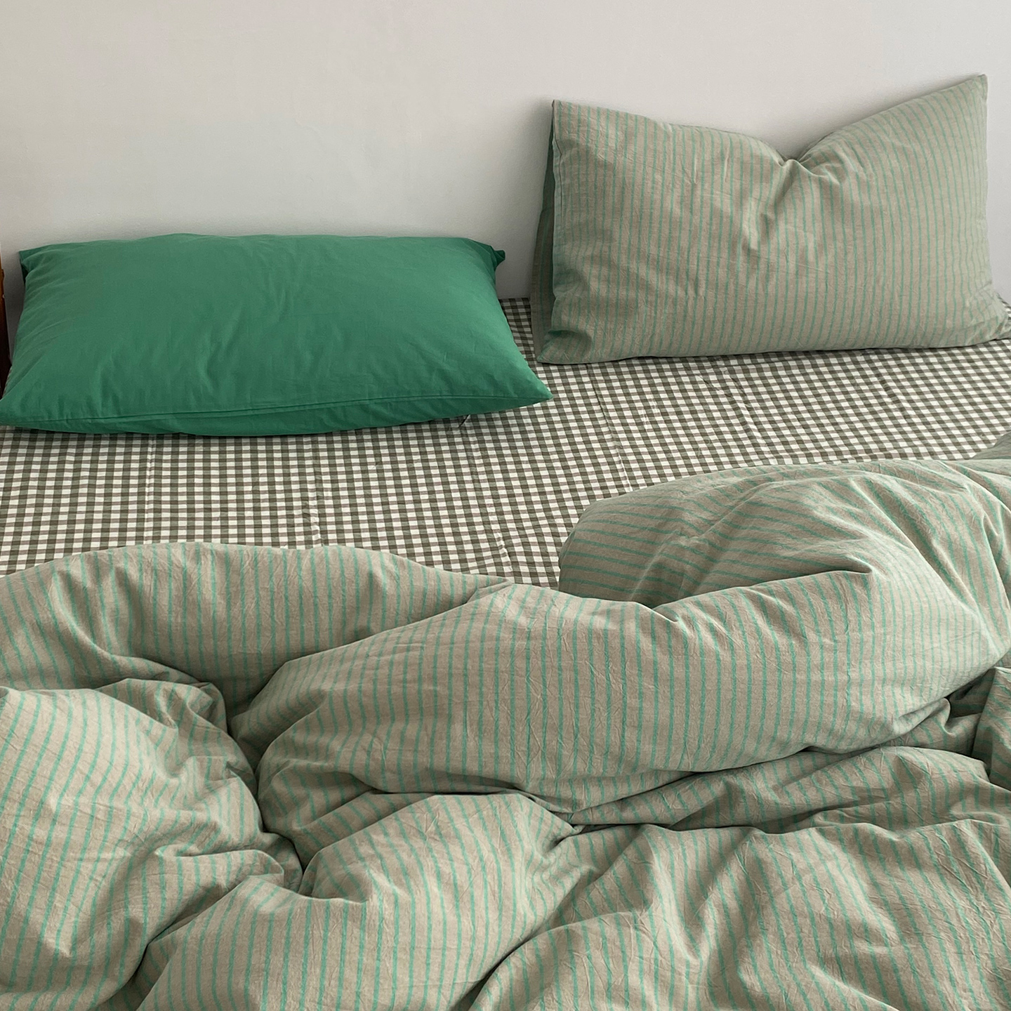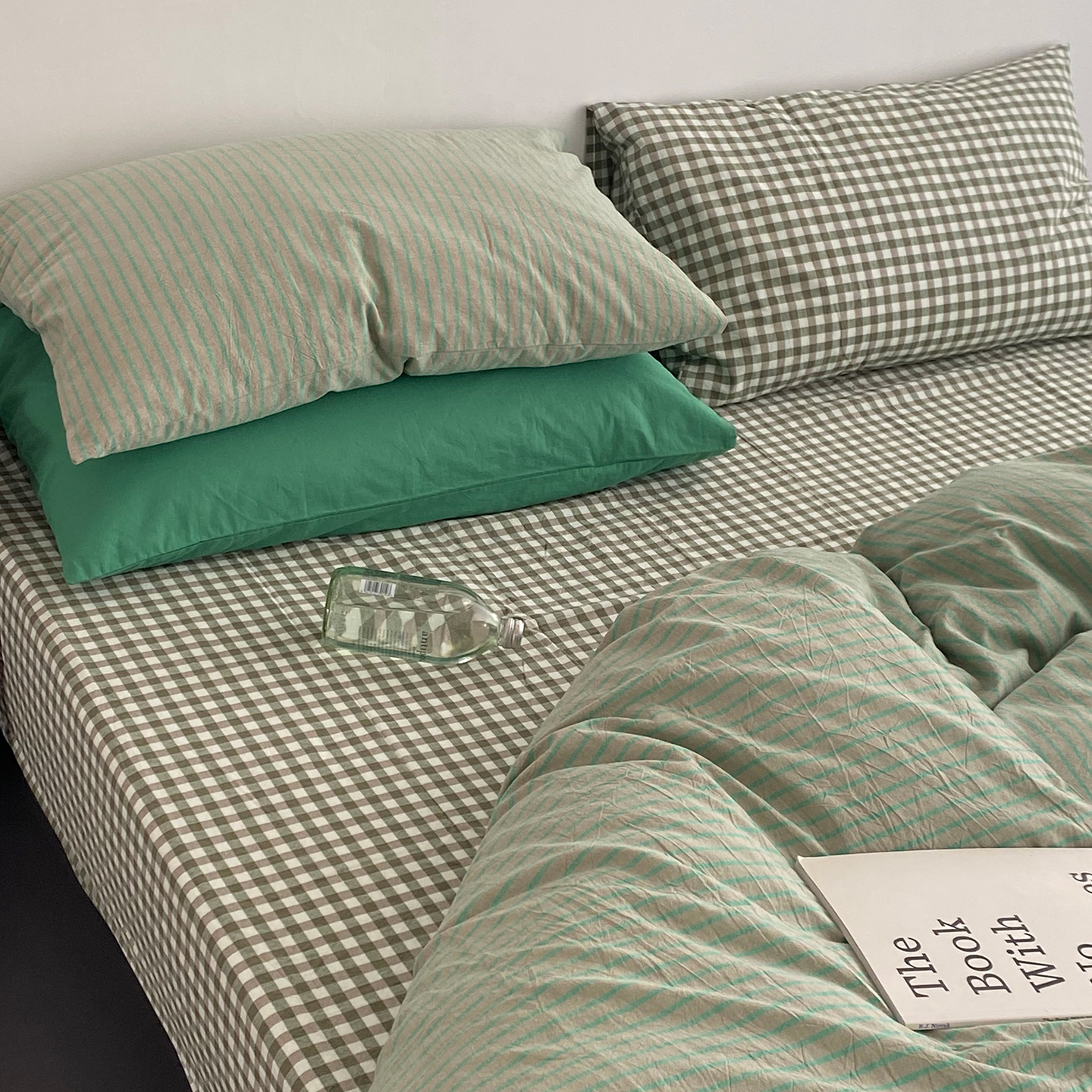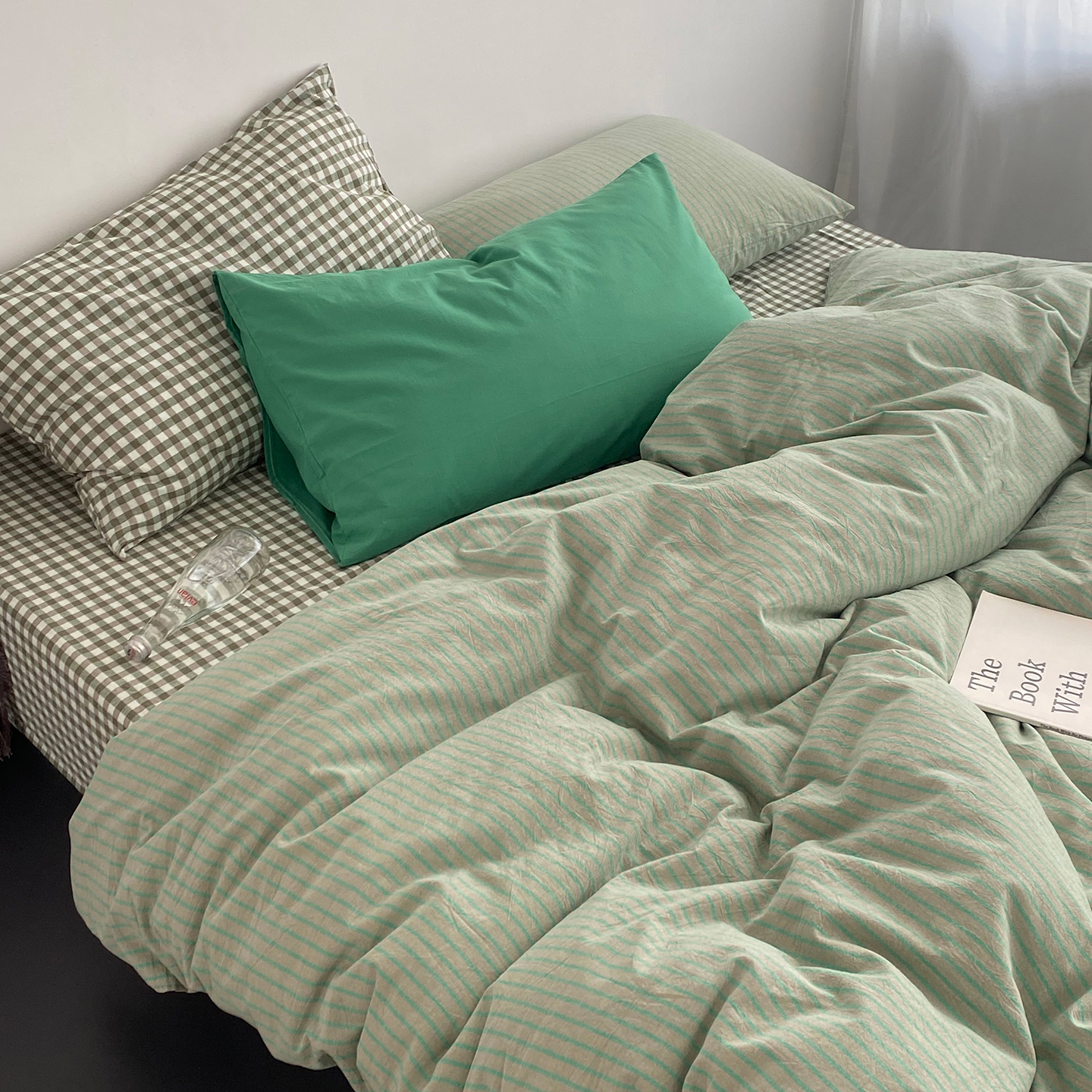 ins风博主款全棉水洗棉撞色纯棉床上四件套纯色格子床单被套床笠