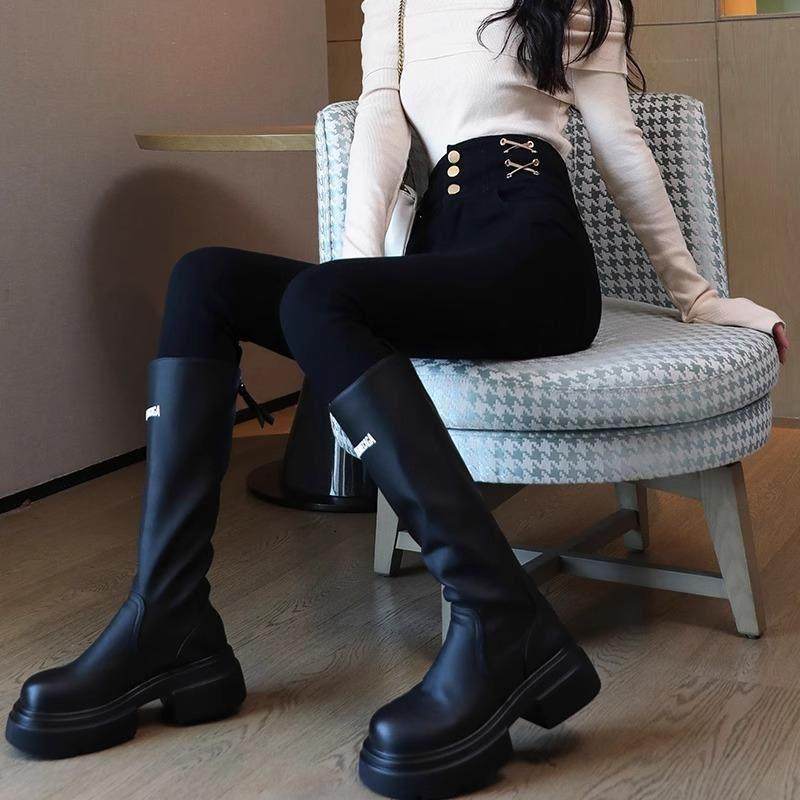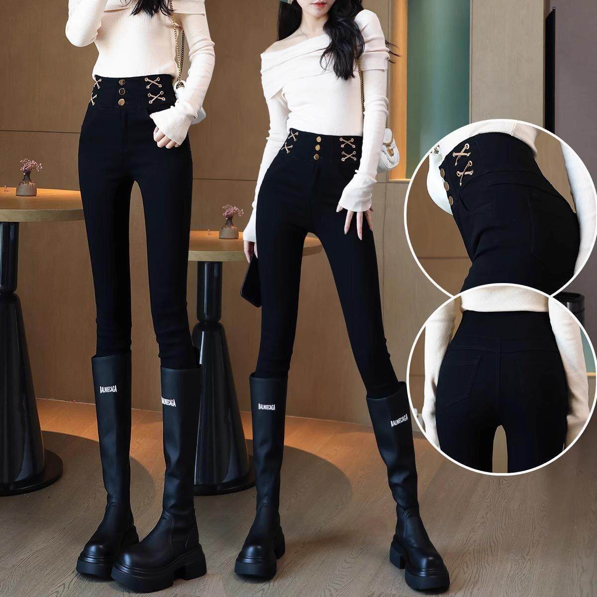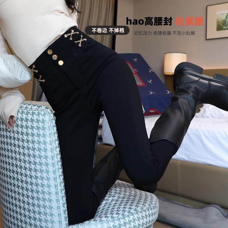 黑色加绒打底裤女外穿2025春秋新款高腰收腹紧身弹力显瘦小脚裤子