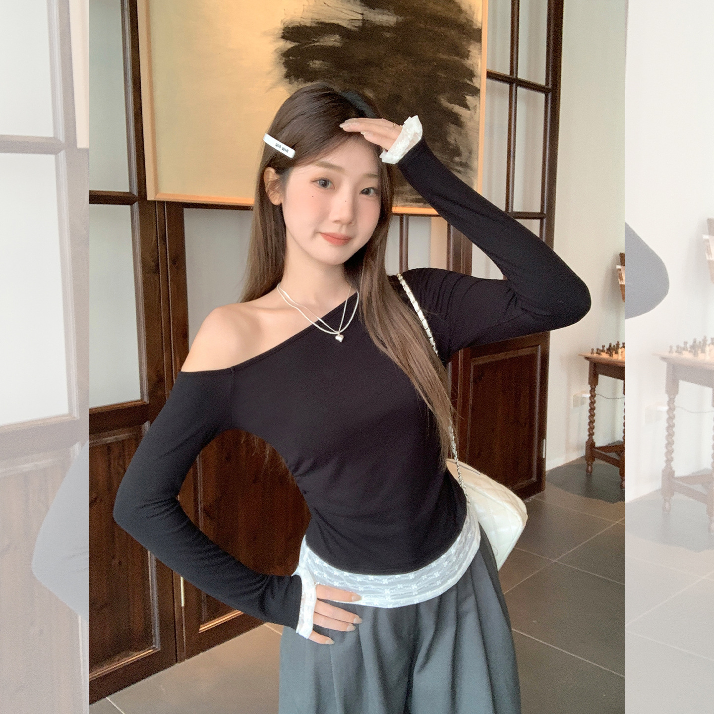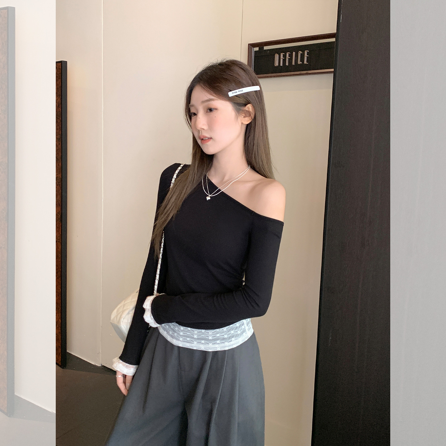黑色假两件蕾丝下摆褶皱长袖T恤女早秋氛围穿搭斜领露肩修身上衣