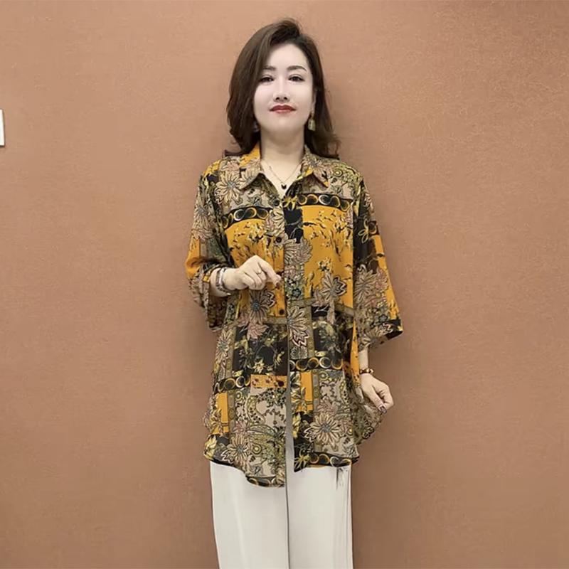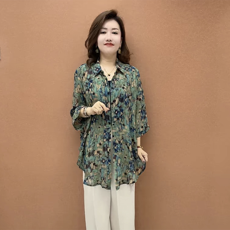 时尚妈妈雪纺碎花衬衫中袖防晒衫