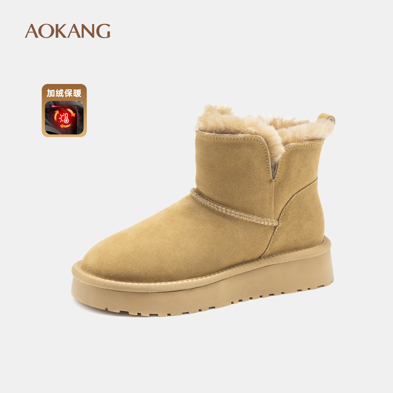 [真皮羊毛]奥康女鞋 冬季百搭加绒保暖毛毛短筒雪地靴