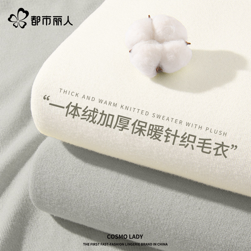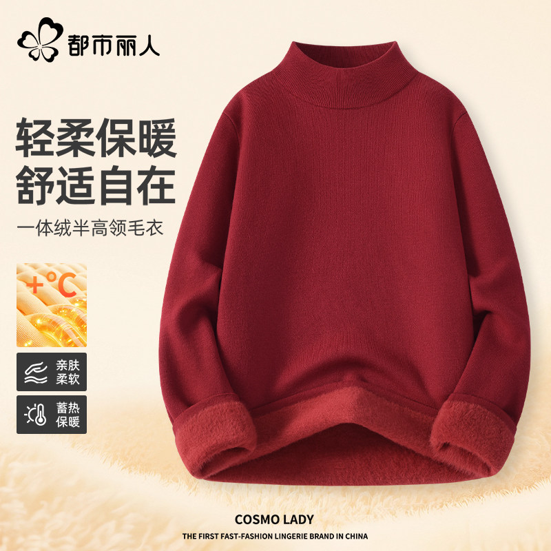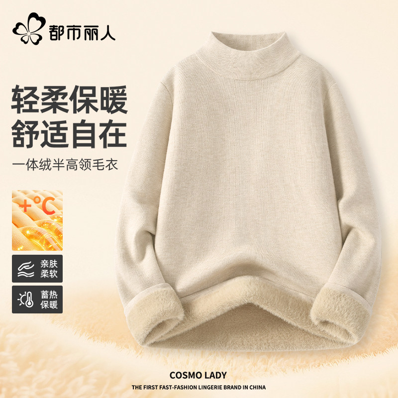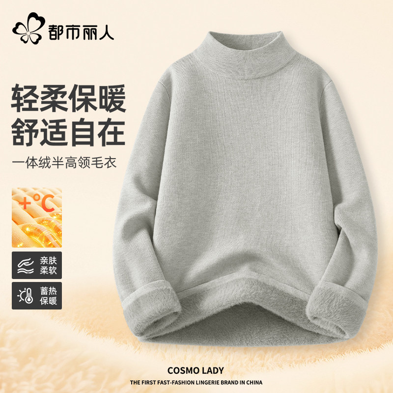 都市丽人灰色半高领毛衣女2026新款冬一体绒针织衫加厚保暖内搭X