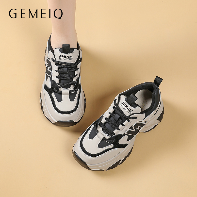 真皮戈美其秋冬时尚厚底增高休闲女鞋系带老爹鞋拼色个性百搭潮鞋