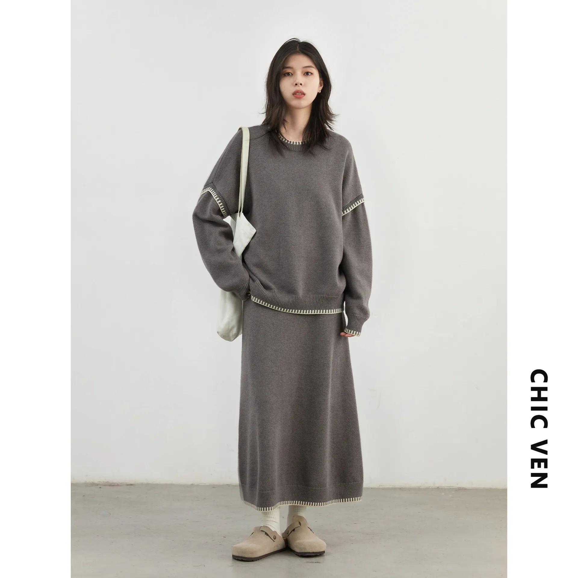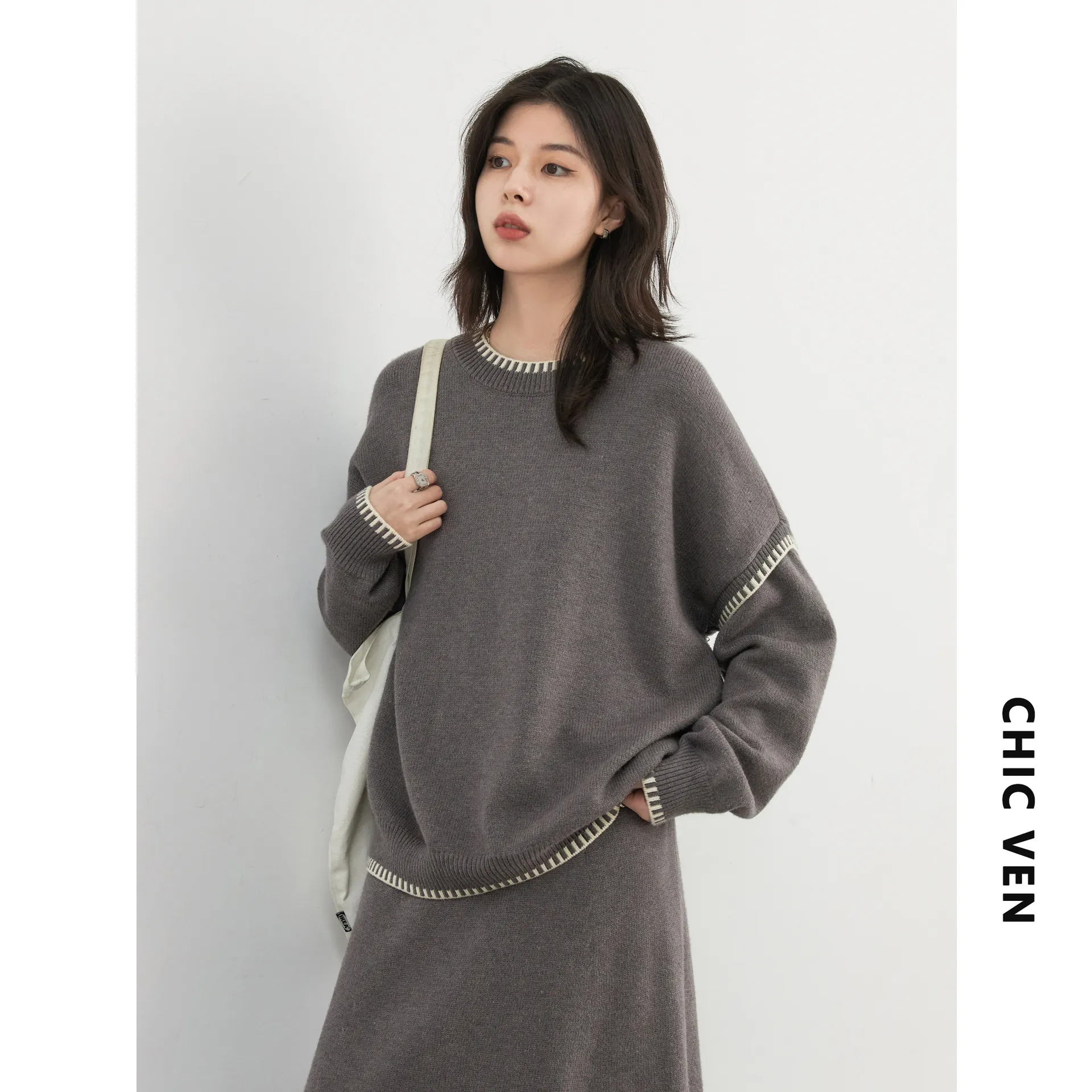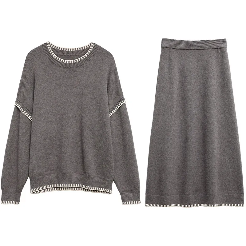 2025新款自由出走秋季新款慵懒感圆领撞色边毛衣针织半身裙套装女
