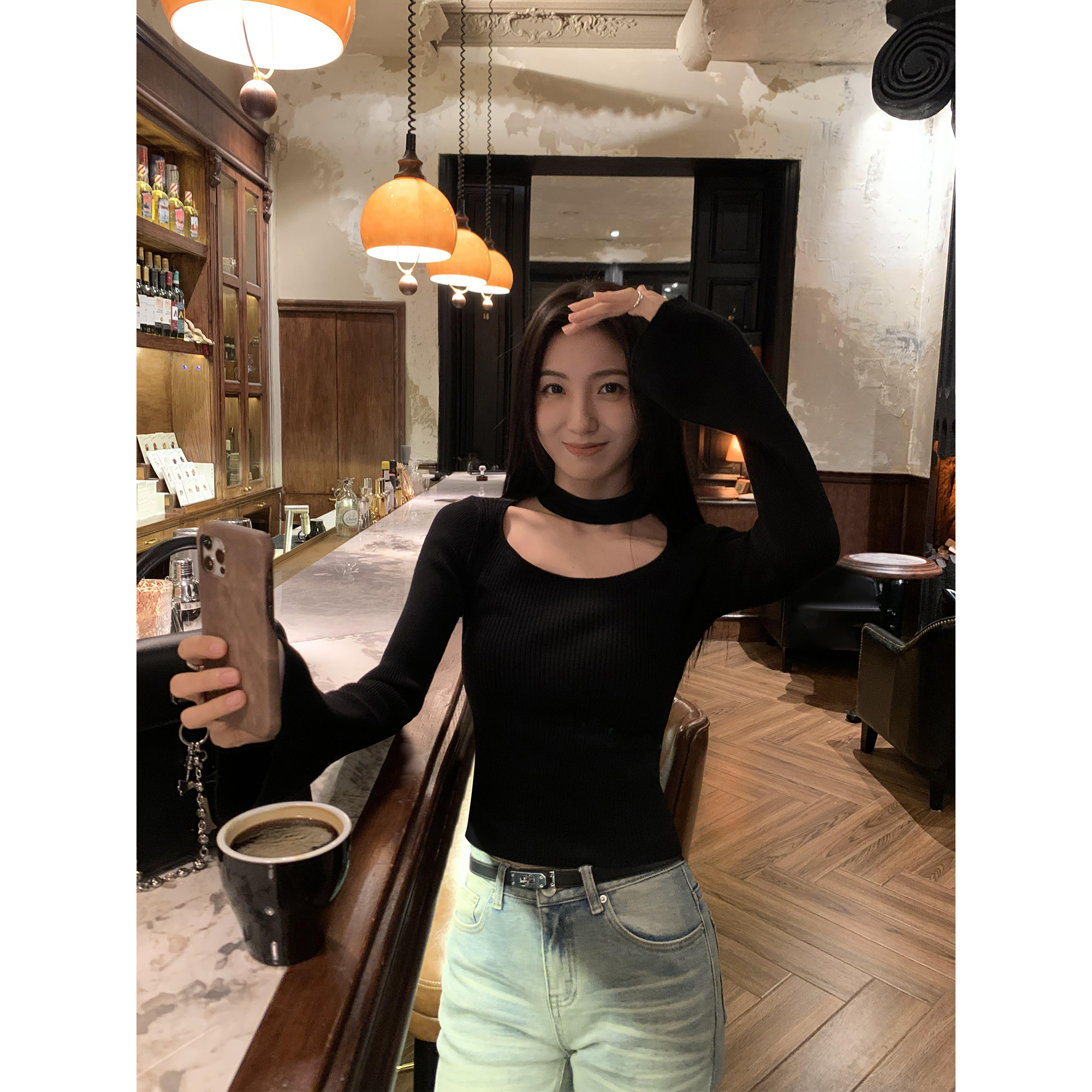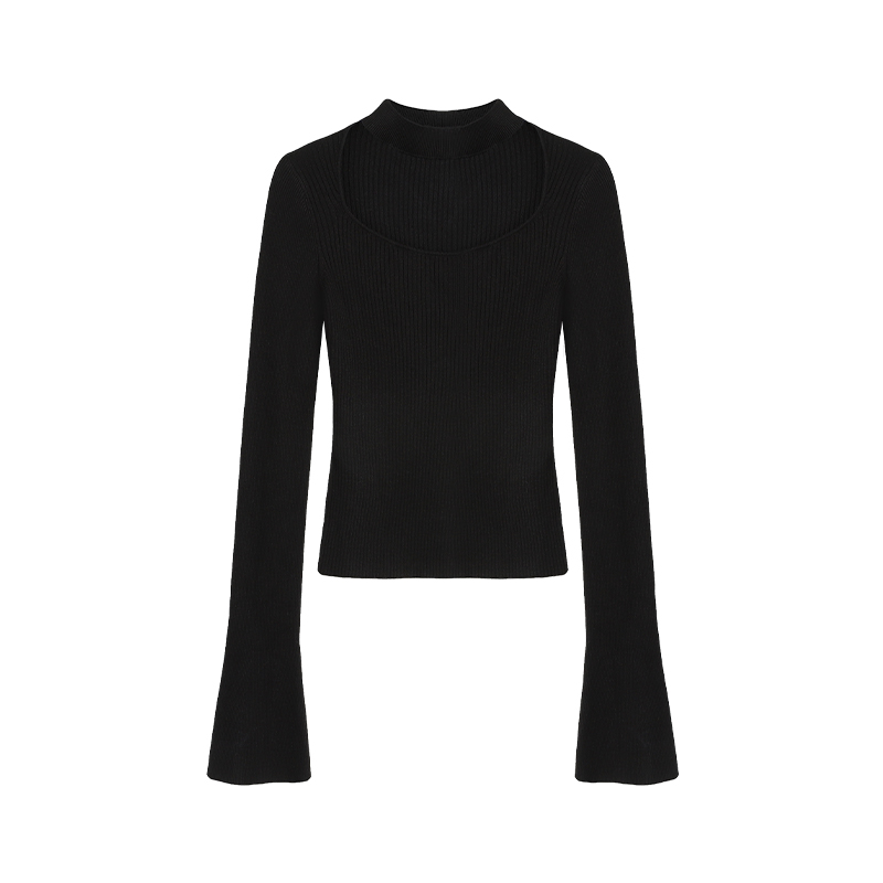 MULVAN 红色挂脖长袖针织衫女秋冬内搭修身显瘦设计感打底衫上衣