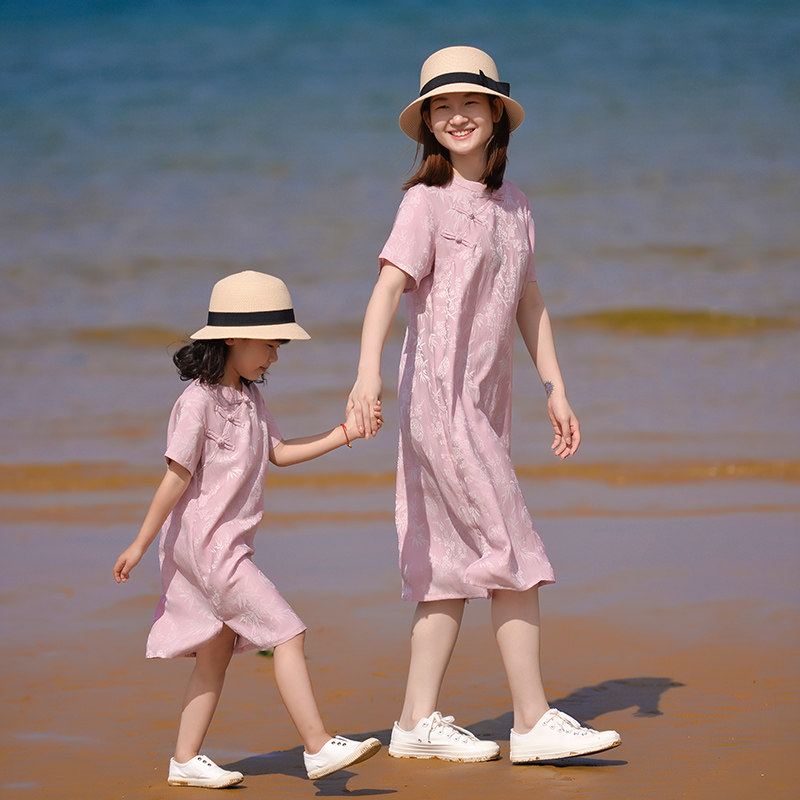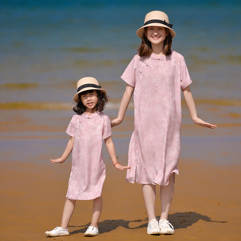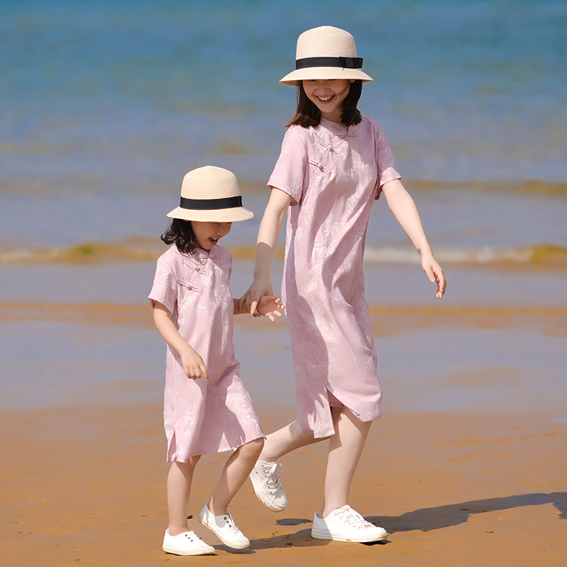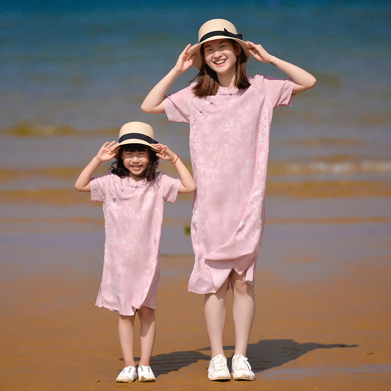 小乐往原创亲子装128课 夏粉色改良旗袍全家福拍照度假母女连衣裙