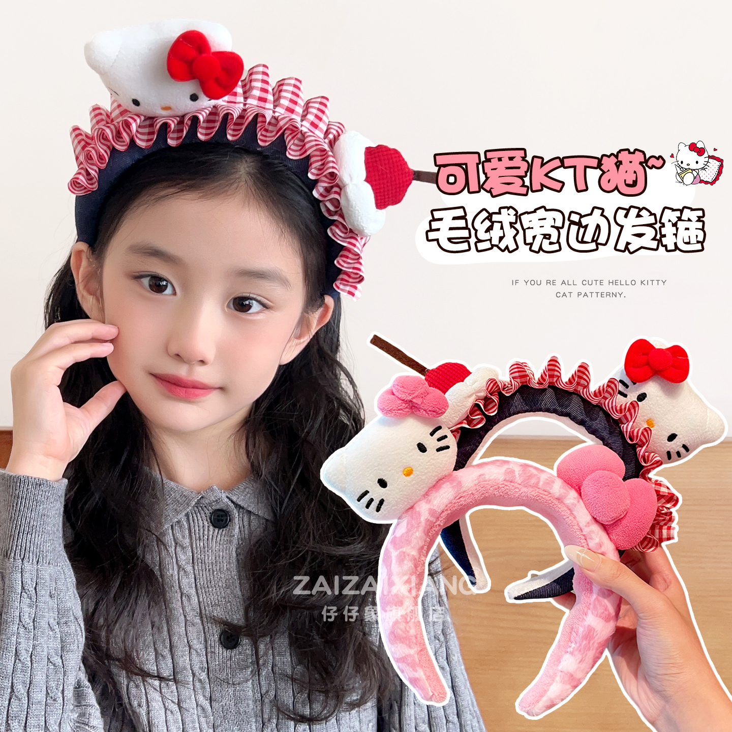 儿童kt猫毛绒发箍秋冬2025新款小女孩发卡头箍高颅顶洗脸拍照头饰
