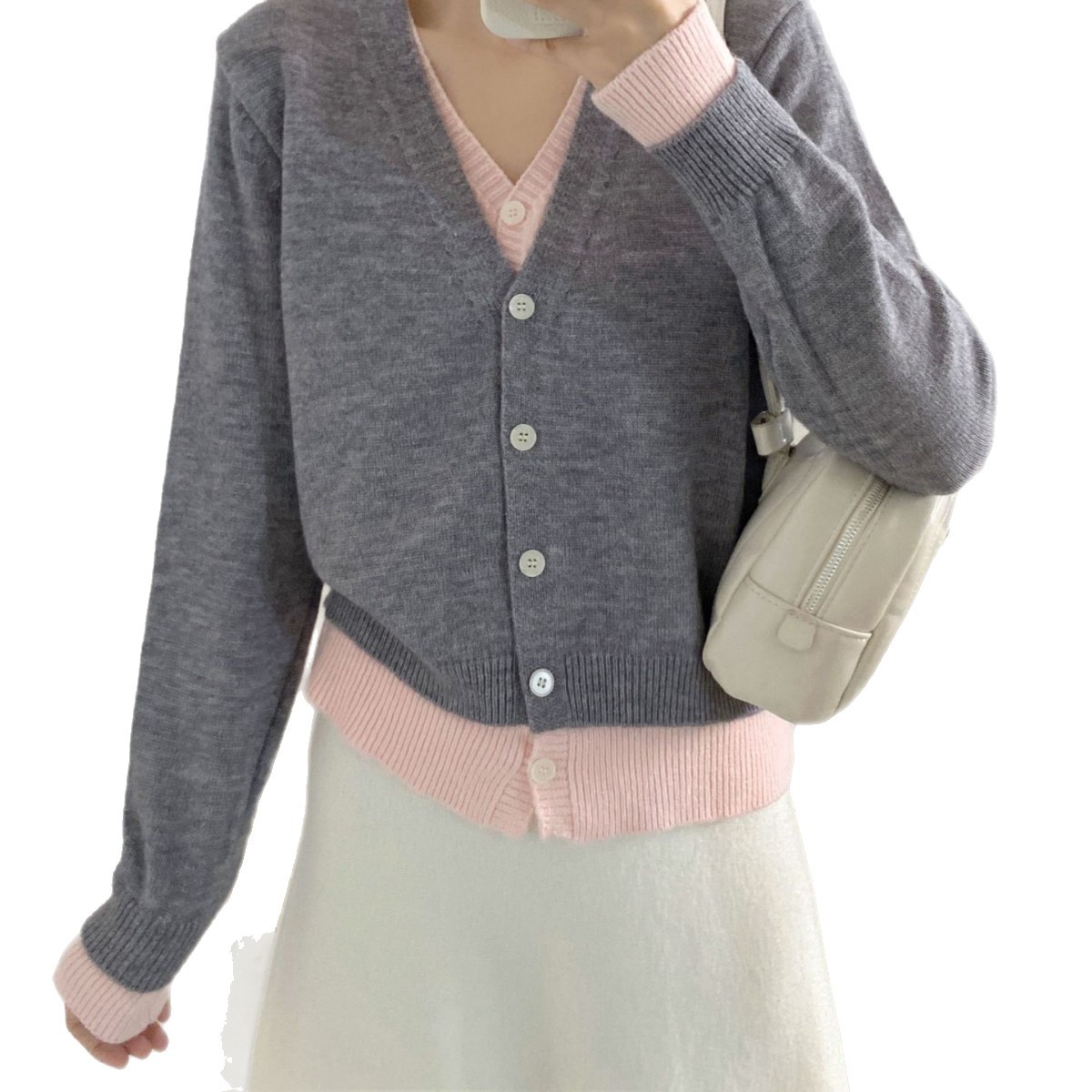 KANING撞色假两件针织开衫外套2025秋季新款设计感V领毛衣上衣女