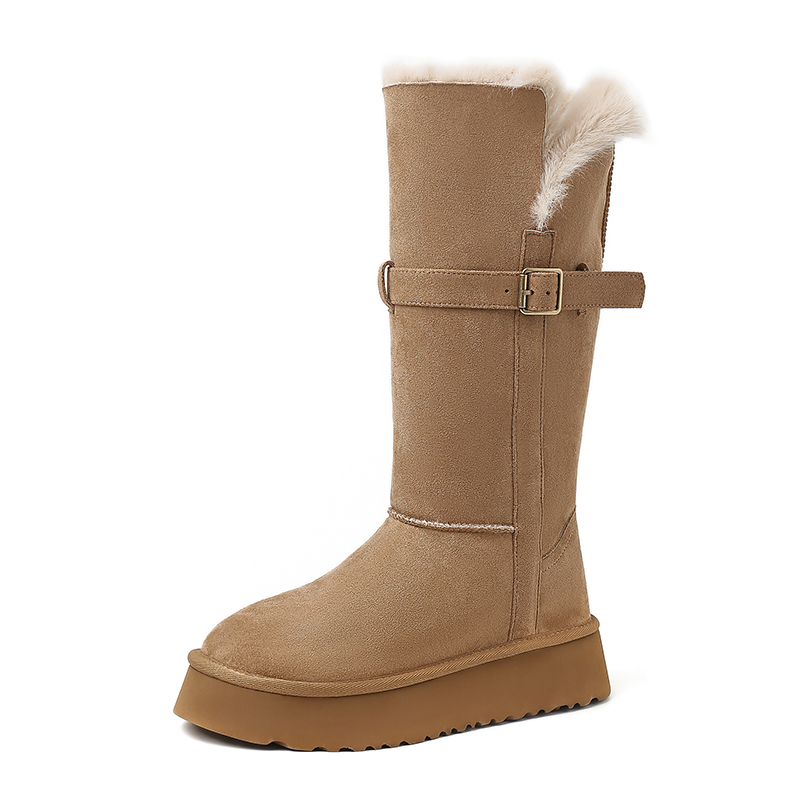 一三良品秋冬可翻边厚底中高筒显高仿皮毛一体羊毛雪地靴栗色短靴