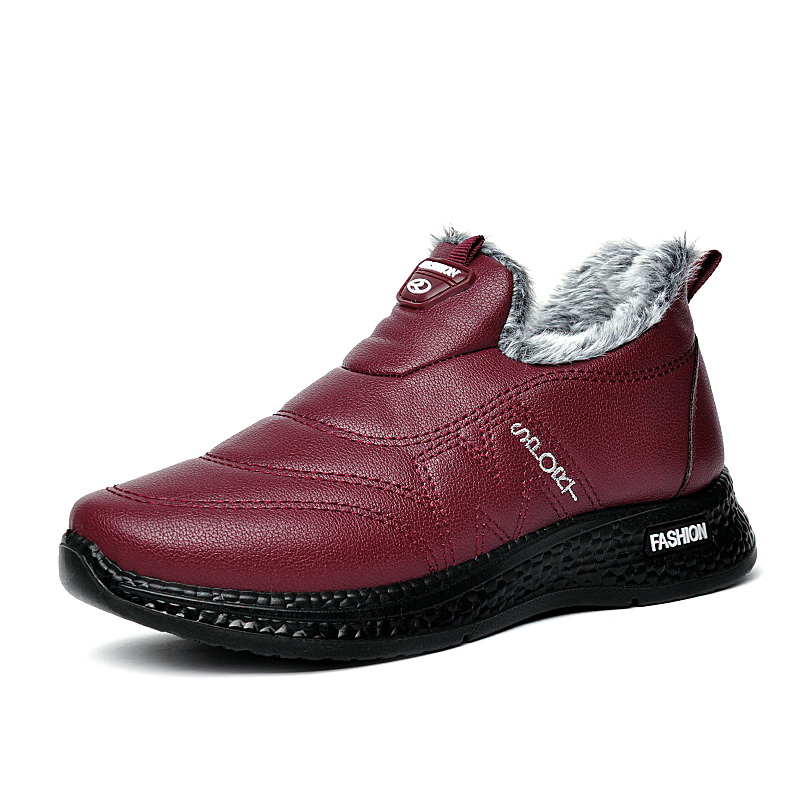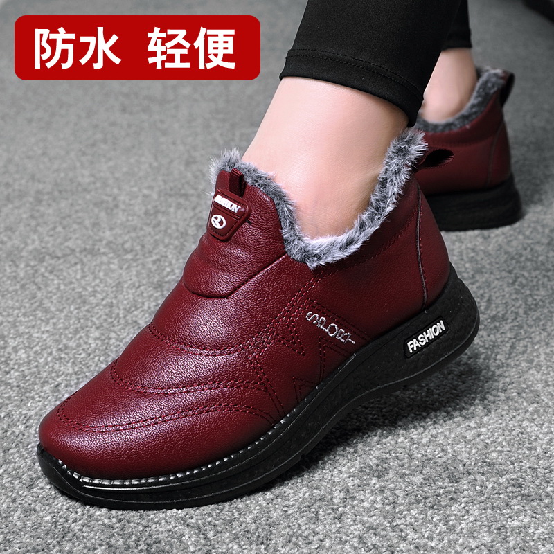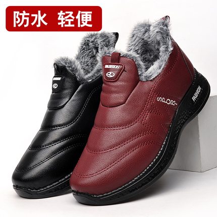 冬季皮棉鞋女中老年加绒保暖防滑软底轻便一脚蹬防水皮面妈妈棉鞋