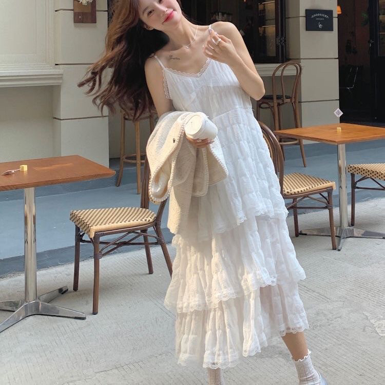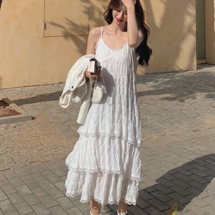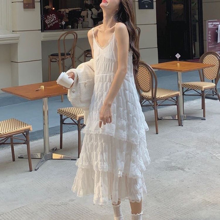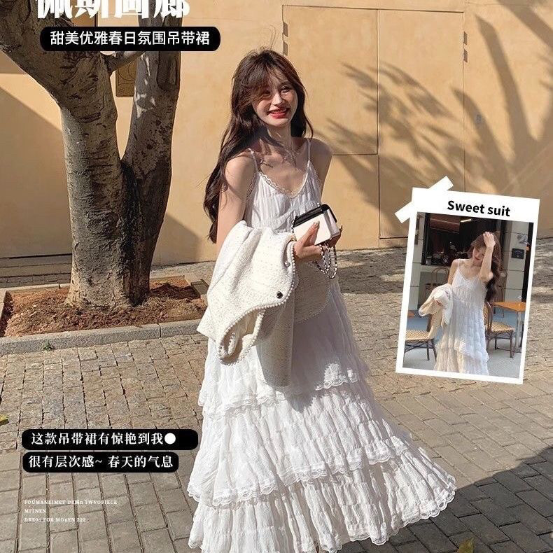白色吊带连衣裙女2025年春夏季新款遮肉显瘦小众复古浪漫蕾丝裙子