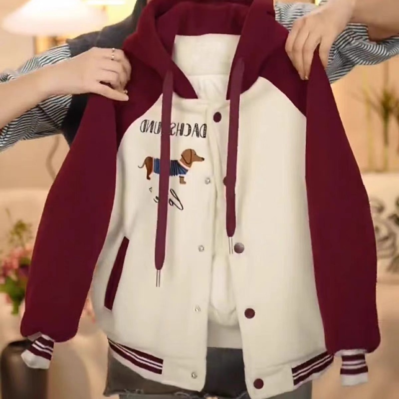 安可拉红夹棉棒球服女童秋冬新款洋气拼色绗棉加厚连帽夹克棉服潮