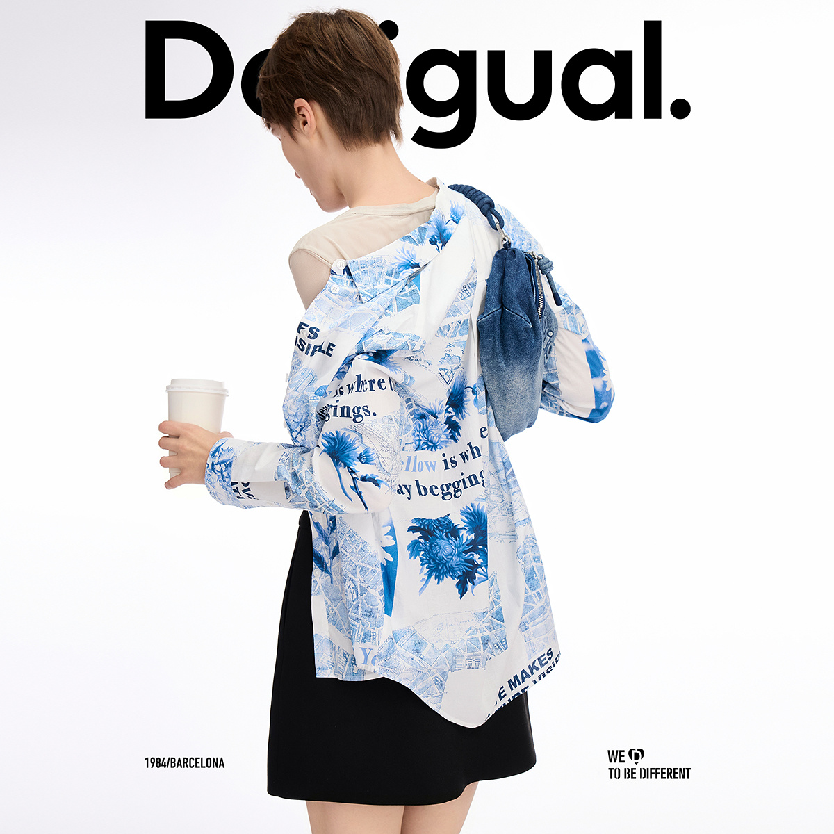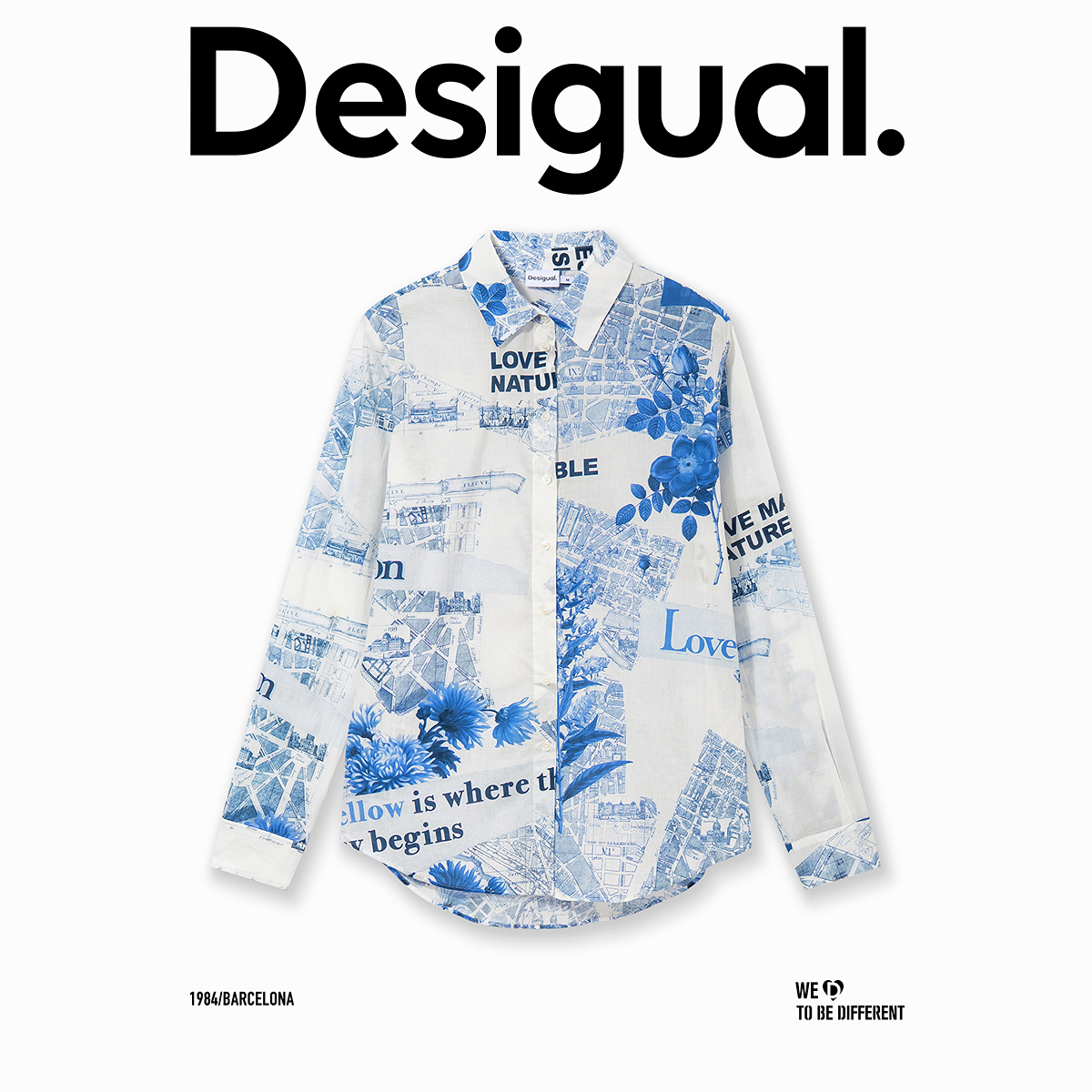 Desigual宽松全棉花卉印花翻领长袖女士衬衫