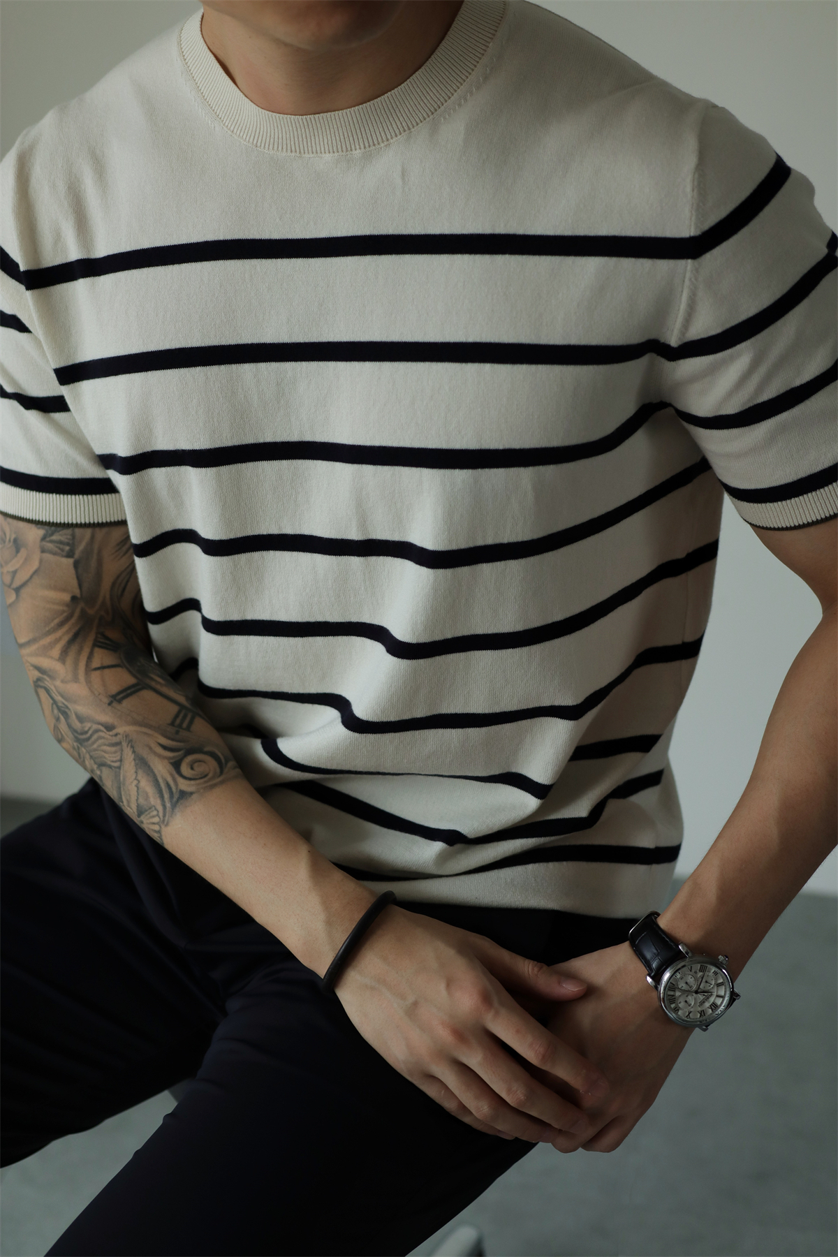 YUXIAN复古针织条纹短袖14针高密