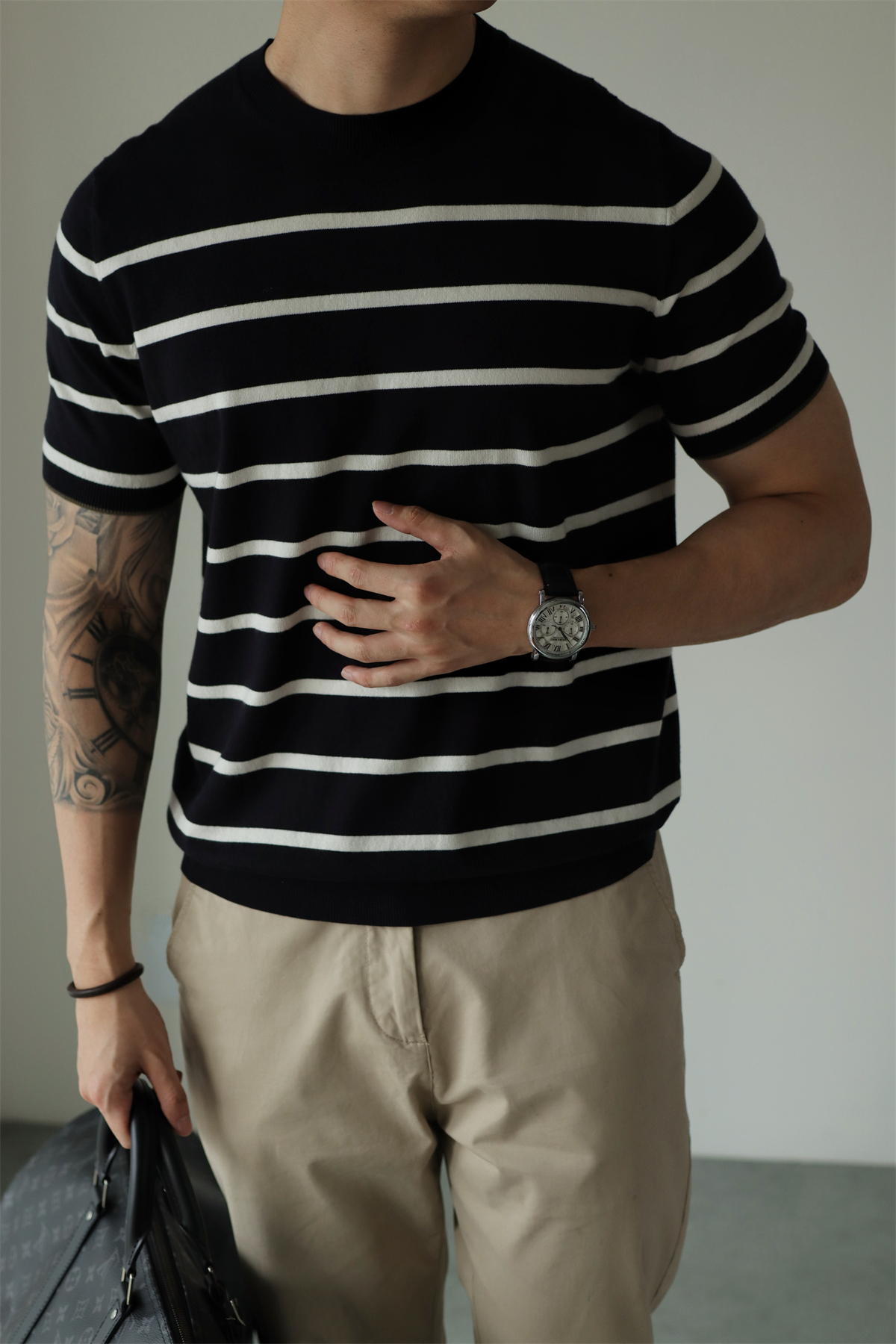 YUXIAN余闲进口14针条纹针织短袖T恤美式复古男士圆领纯色春夏季