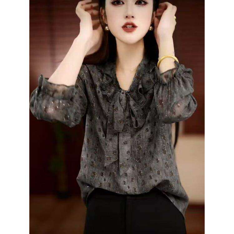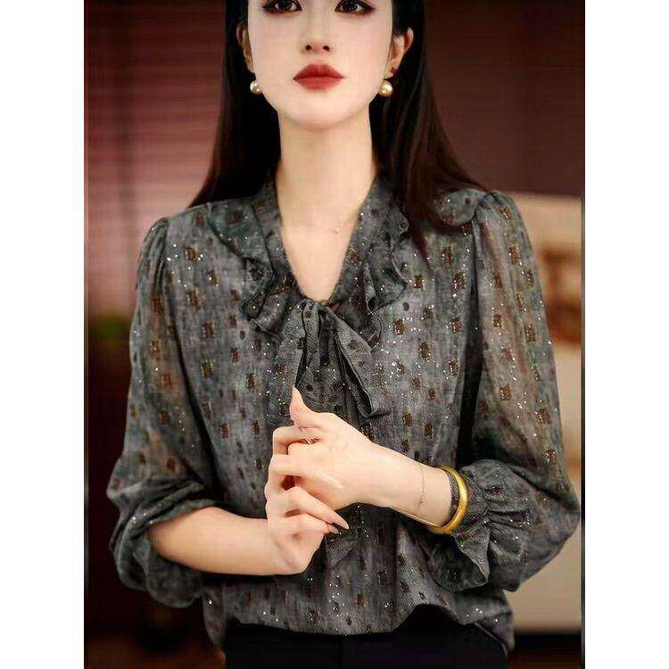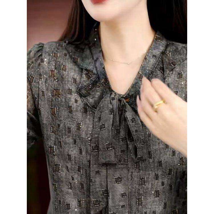 春季新款洋气印花飘带小衫H时尚妈妈装气质百搭显瘦长袖上衣女