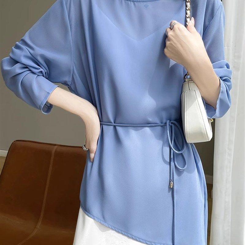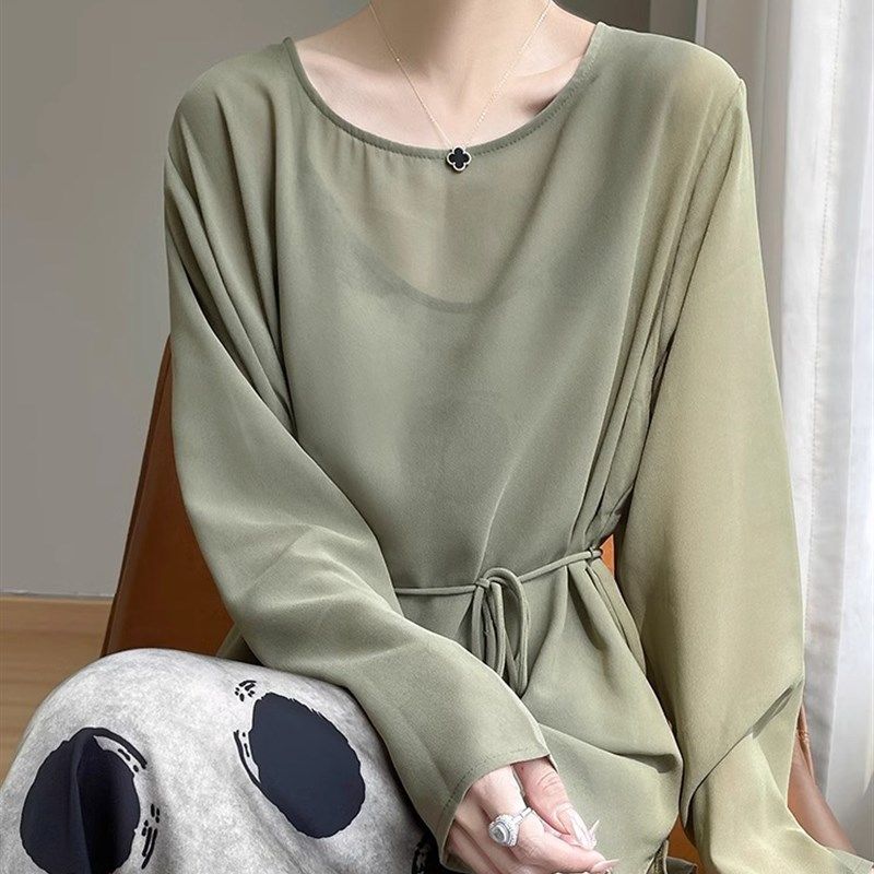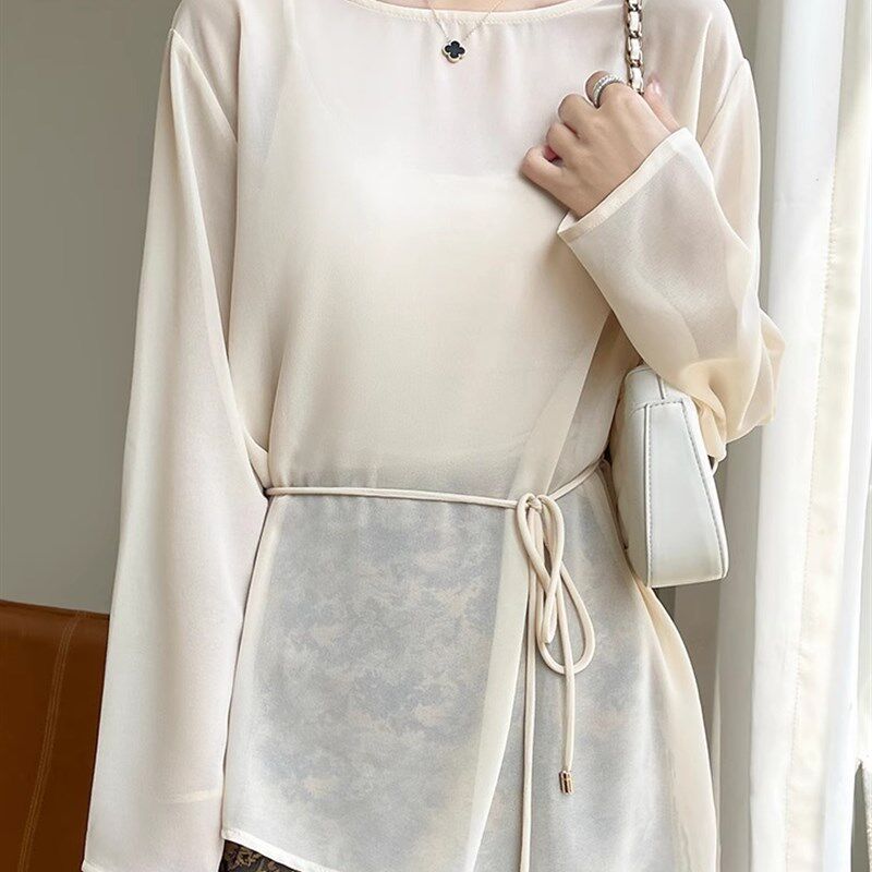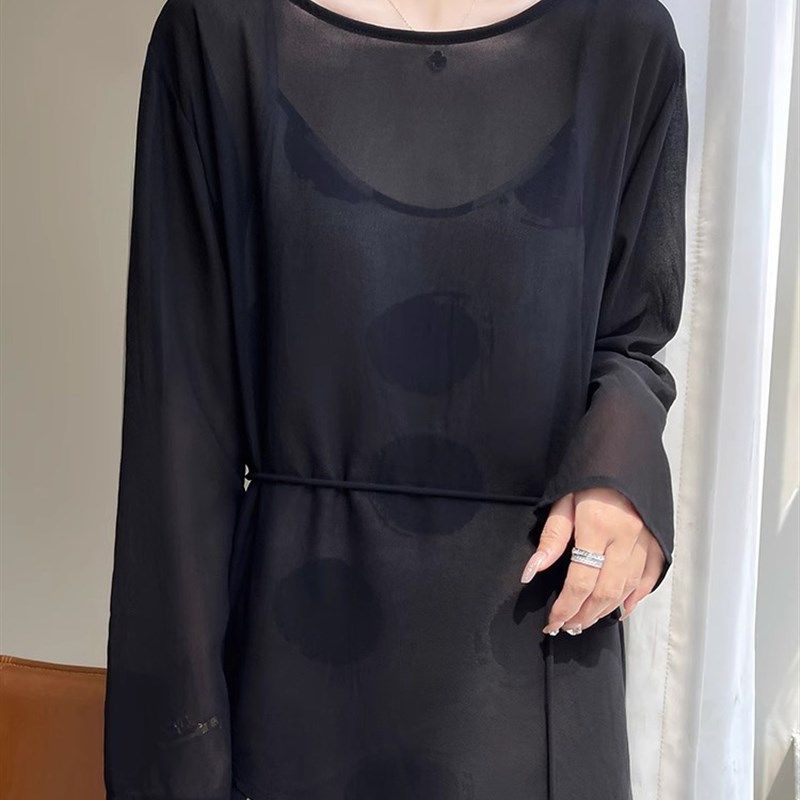 法式轻薄微透圆领长袖衬衫女宽松开叉外搭空调防晒衫设计感上衣
