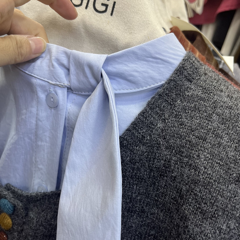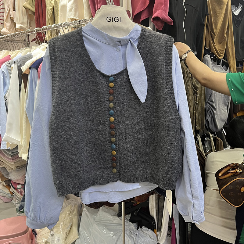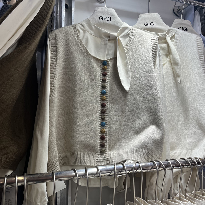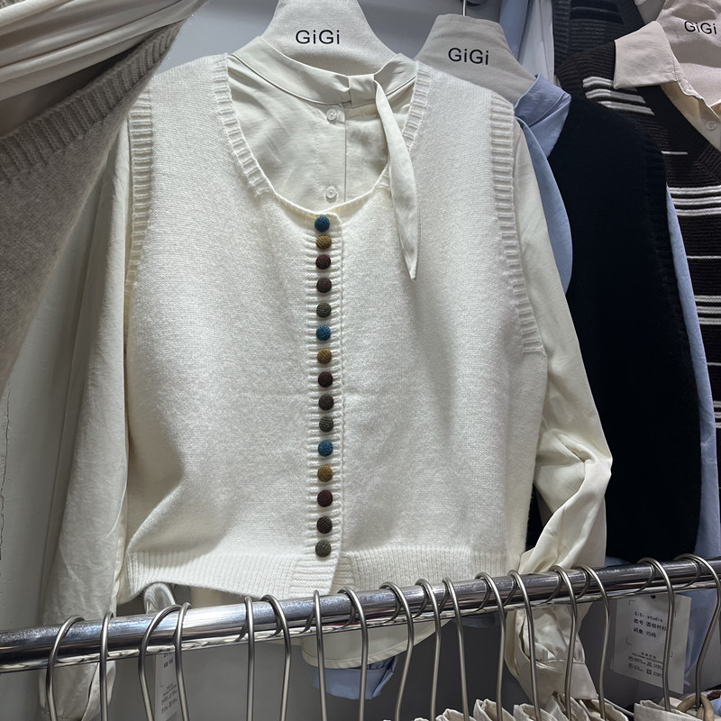 一整套穿搭高级感时尚针织彩扣马甲女气质娃娃领简约显瘦衬衫套装