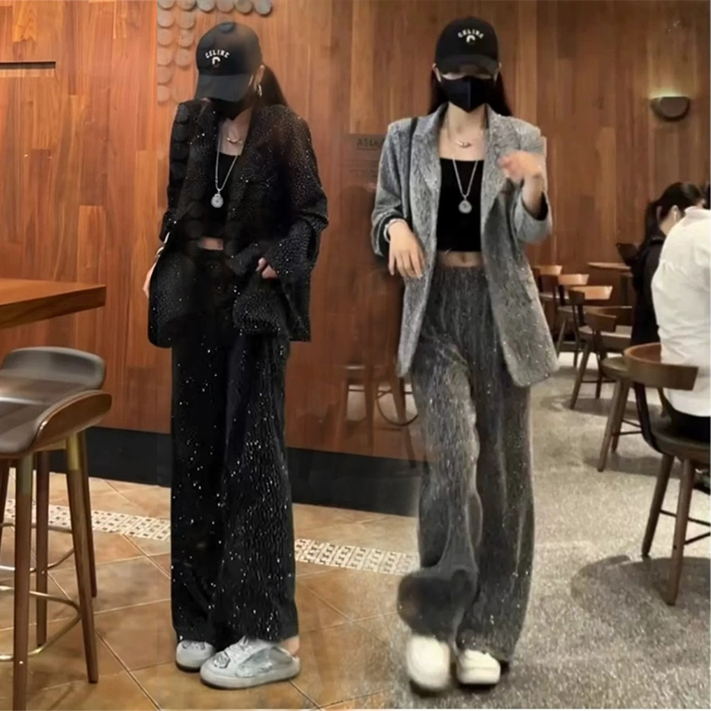 2025春季新款西服套装气质百搭烫钻闪西装外套高腰显瘦长裤两件套