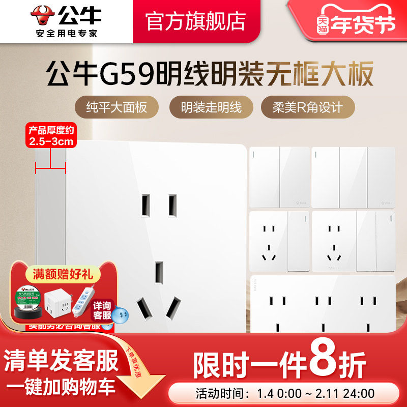 公牛插座旗舰无框明装插座亮面白
