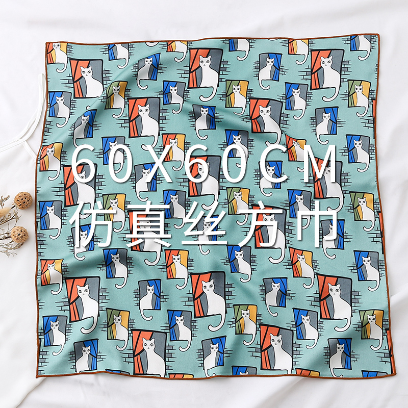 猫咪儿童可爱小方巾丝巾女百搭春秋纱巾薄围巾脖子搭配衬衫60x60