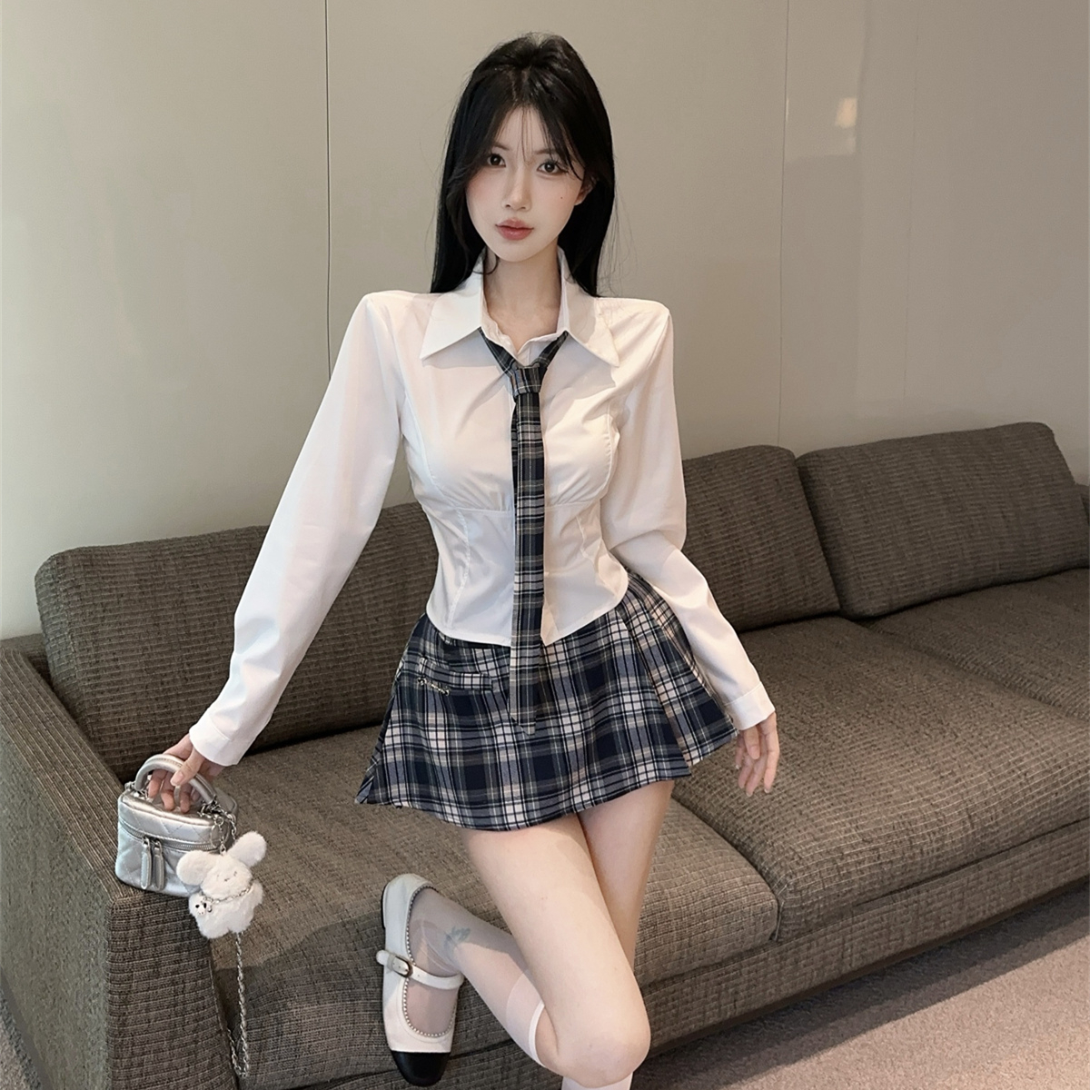 2025秋冬新款时尚套装女学院风长袖衬衫格子半身裙辣妹风两件套潮
