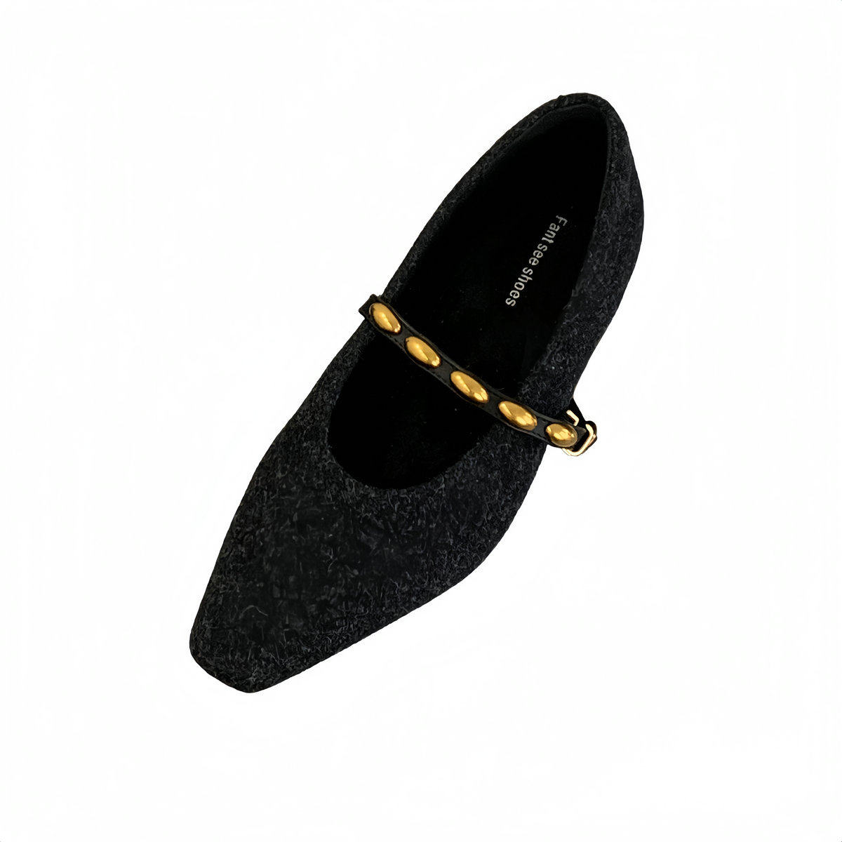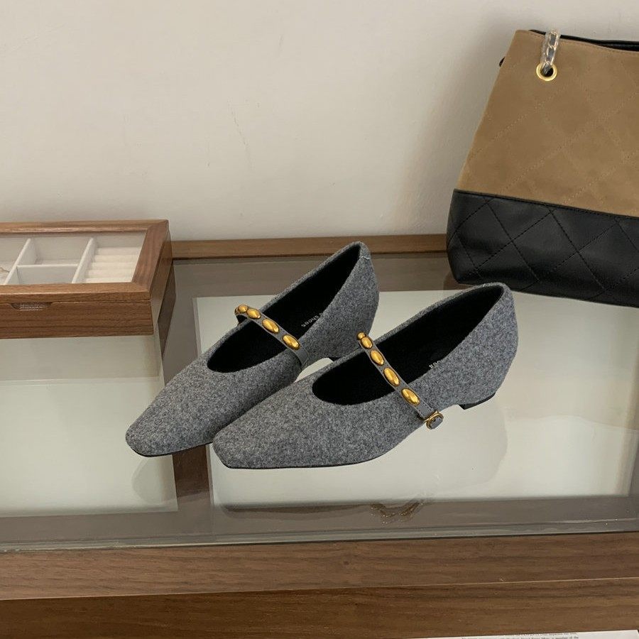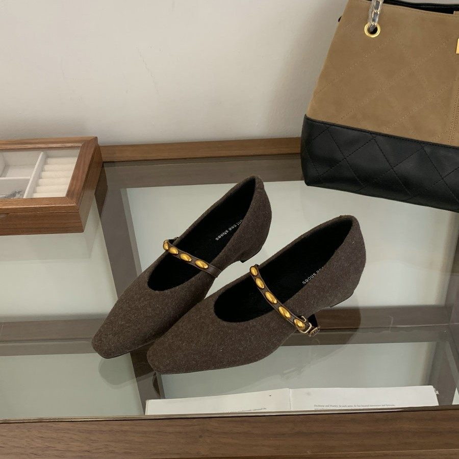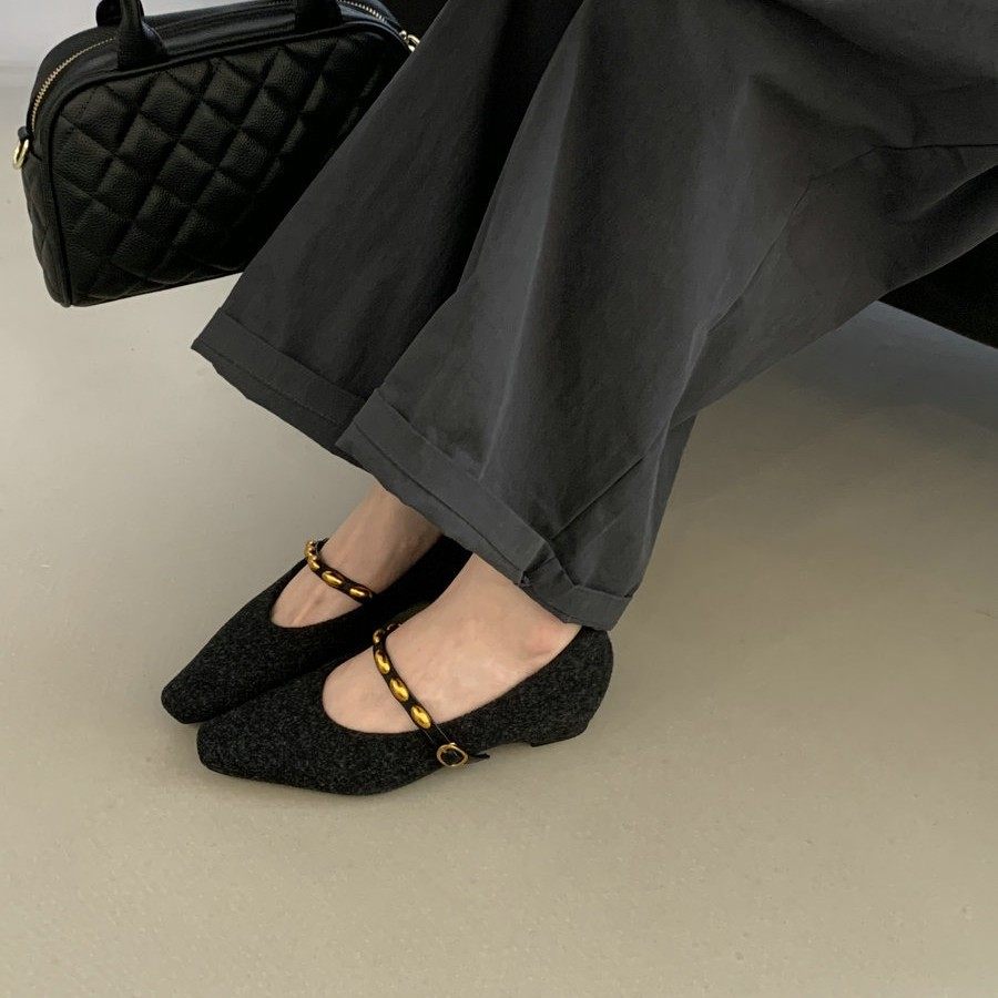 法式复古一字式扣带方头通勤单鞋女内增高毛呢玛丽珍女鞋