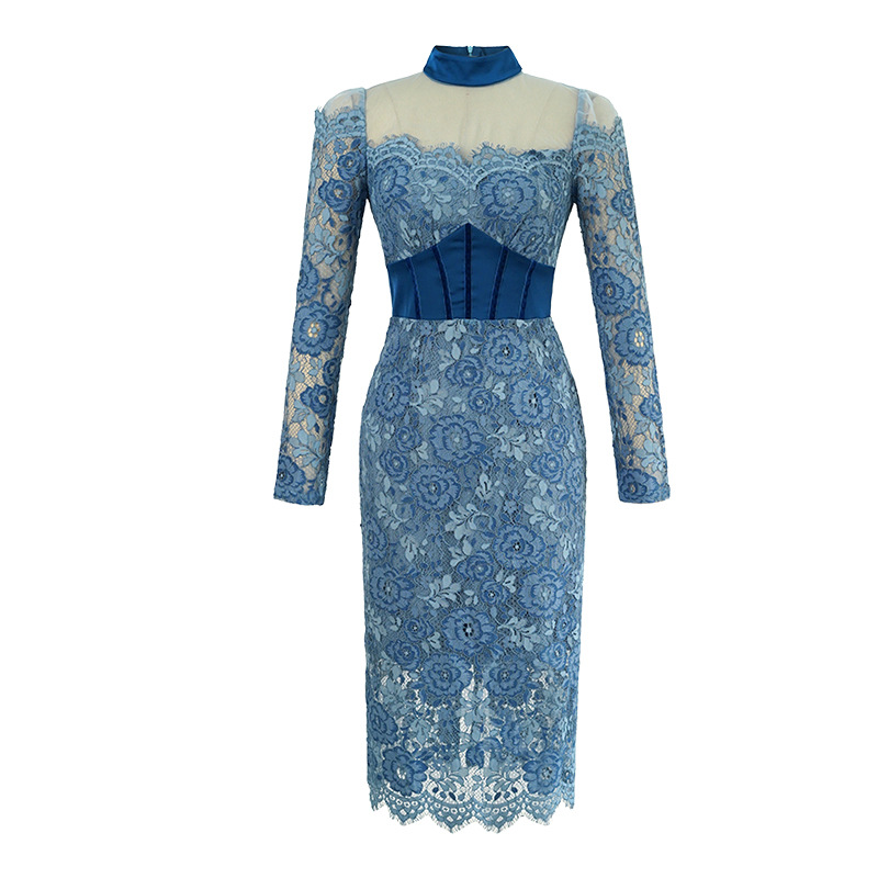 秋季新款设计感拼接修身包臀蕾丝连衣裙女惊艳气质法式长裙20767