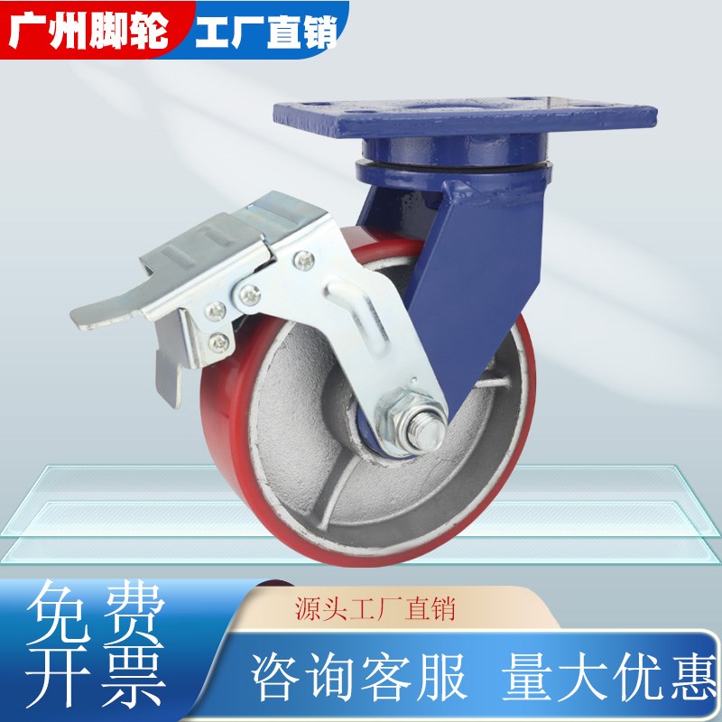 超重型聚氨酯PU脚轮6寸10寸万向刹车轮铁芯PU耐磨载重一吨手推车