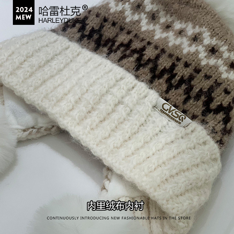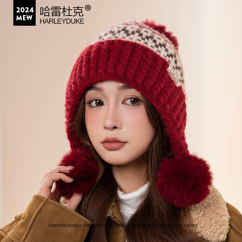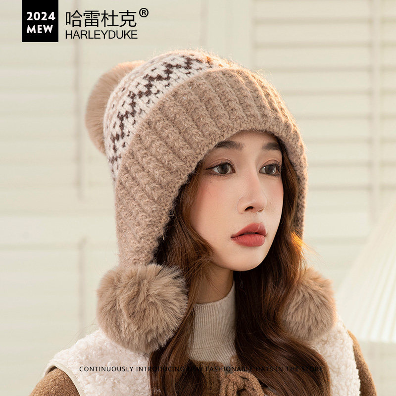 提花三球加绒毛线帽子女秋冬后开叉翻边护耳雷锋帽时尚百搭显脸小