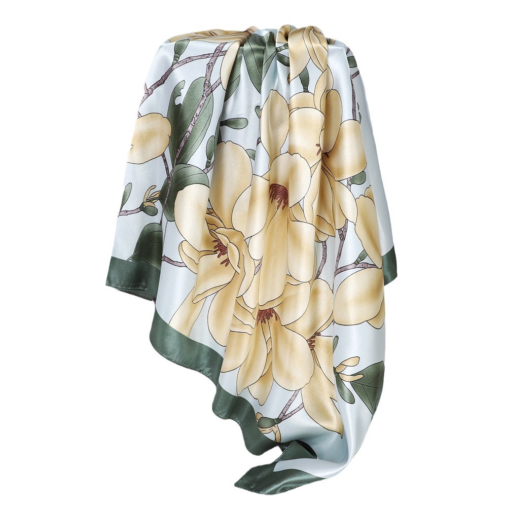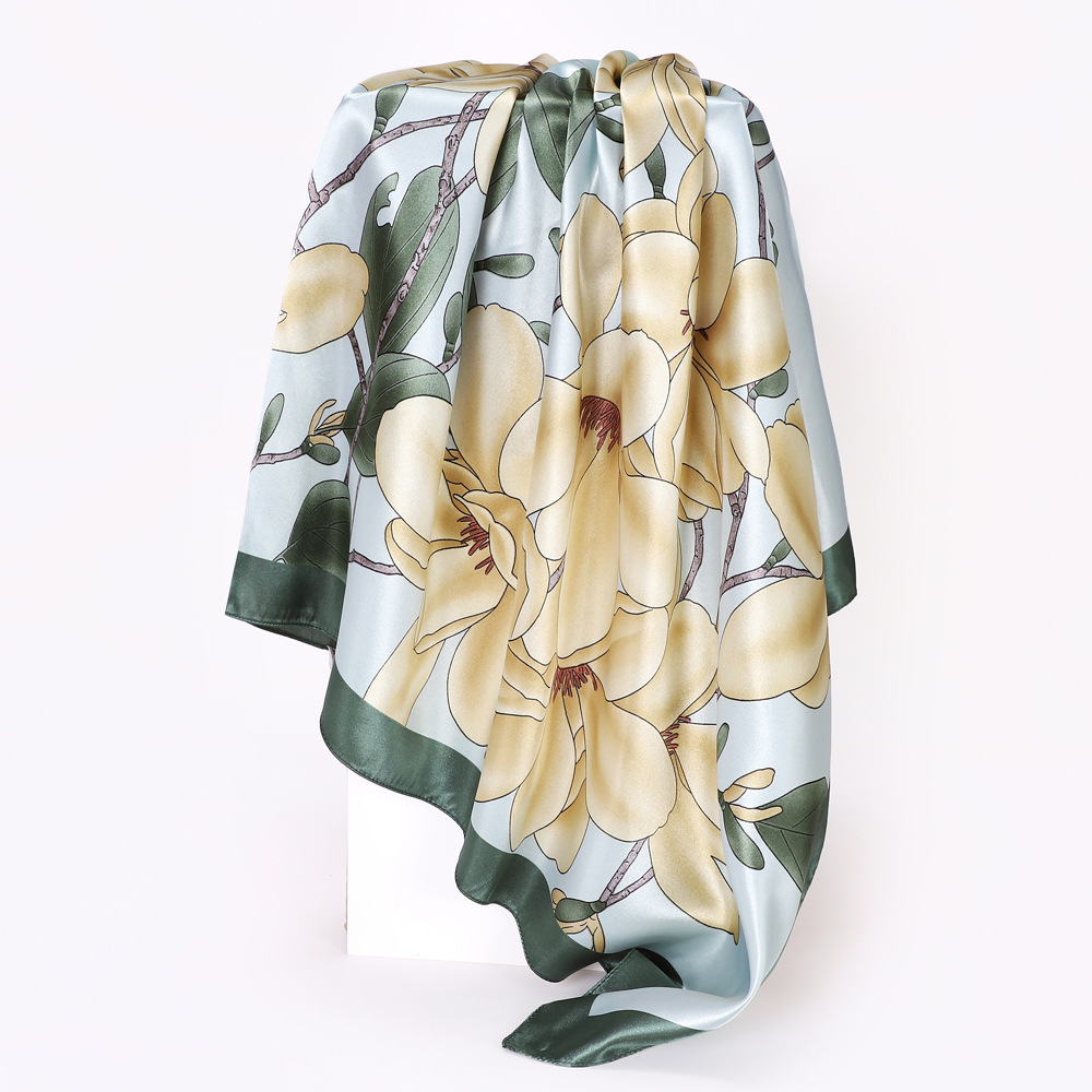 新款绿色玉兰花大方巾女仿真丝丝巾缎面印花头巾色丁围巾