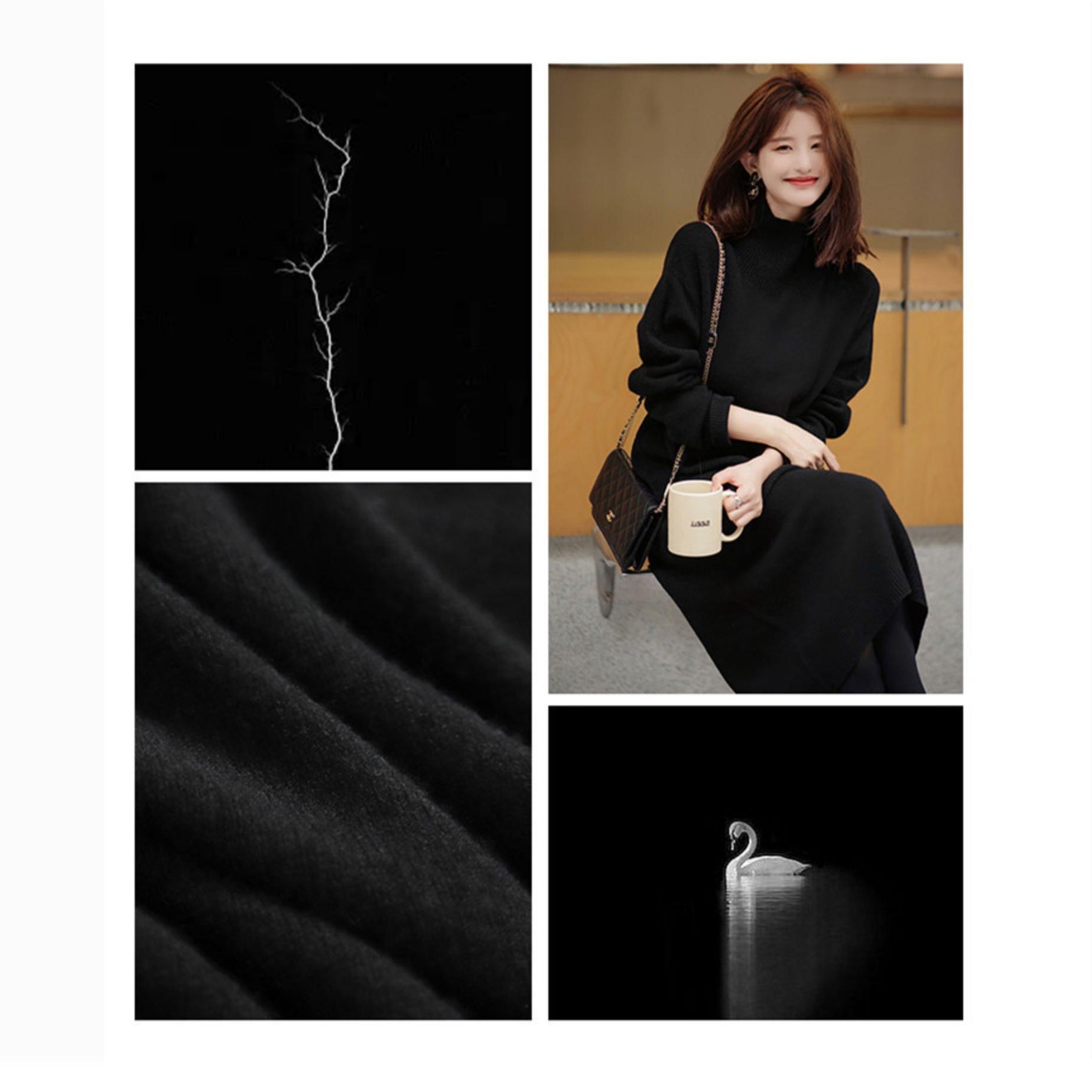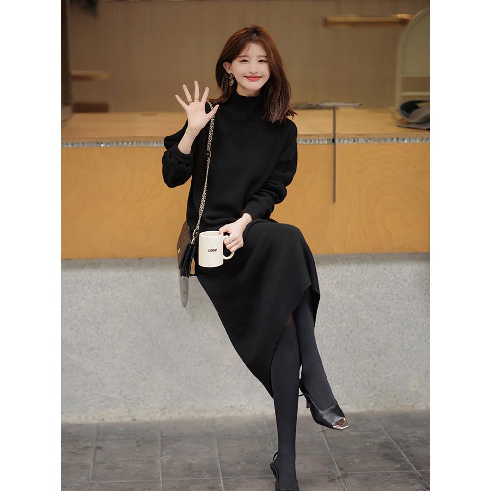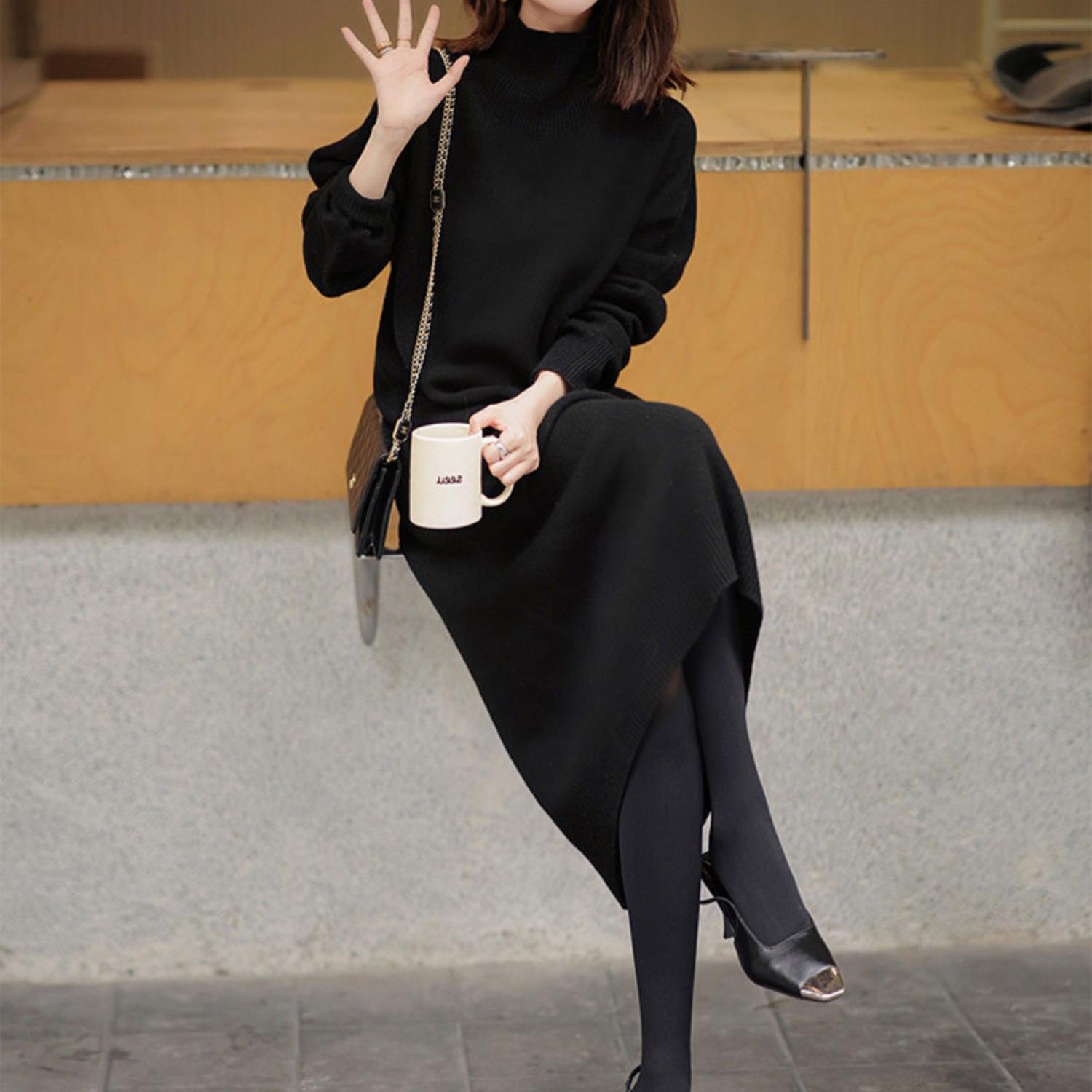 欧洲站2025秋冬新款内搭打底长款毛衣裙过膝赫本风黑色针织连衣裙