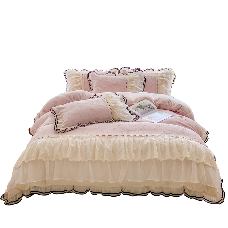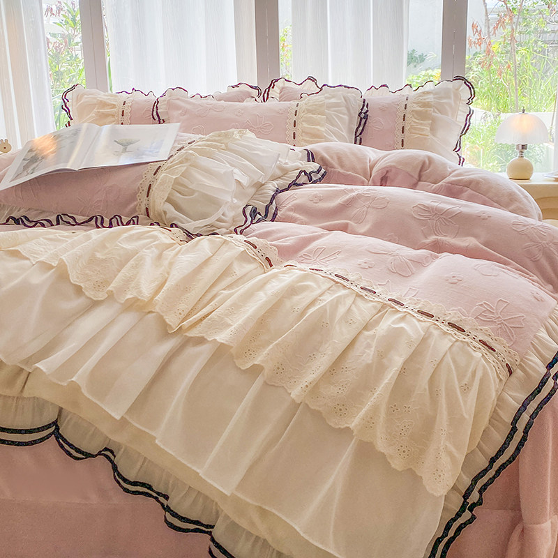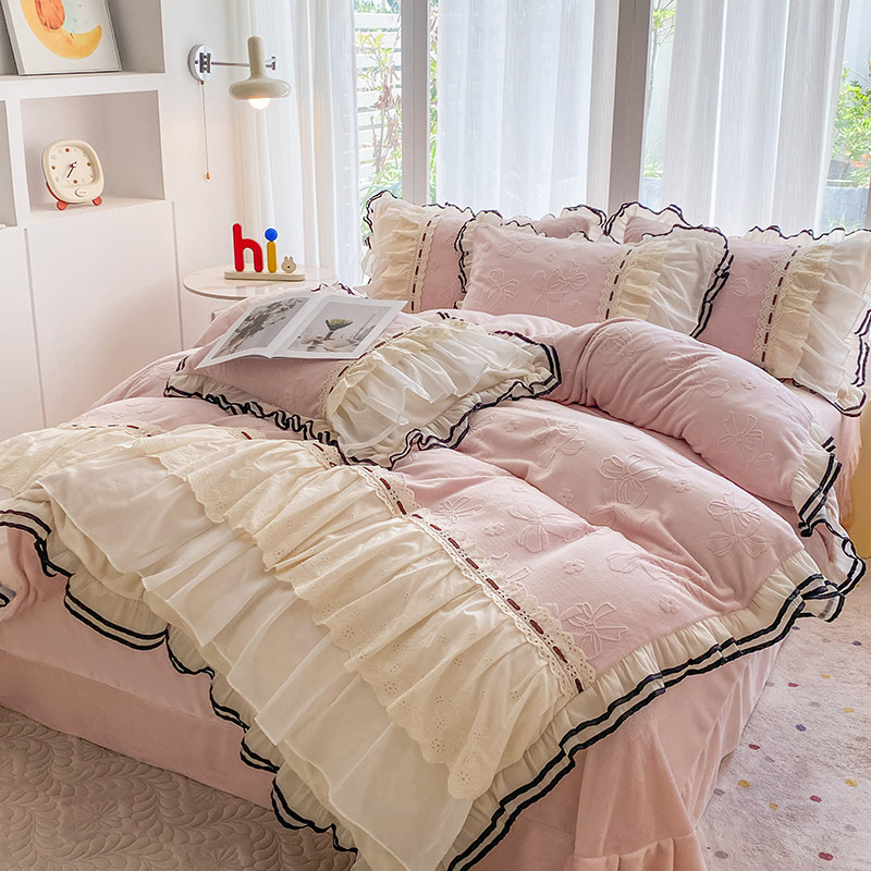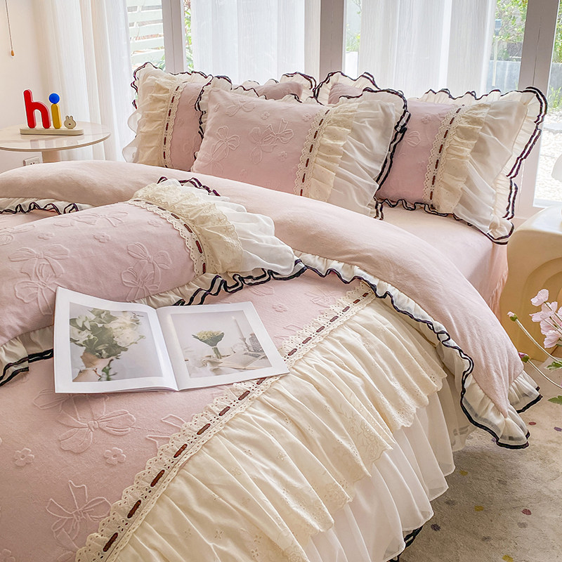 冬季加厚牛奶绒四件套雕花绒蕾丝花边双面加绒珊瑚绒公主风被套