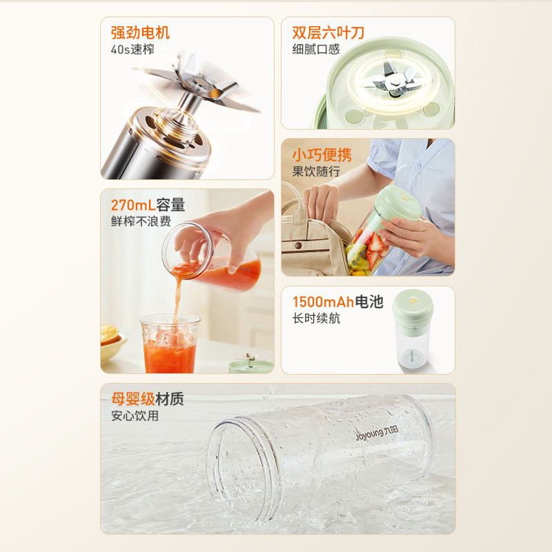 九阳便携式榨汁机小型宿舍多功能炸果汁无线充电水果榨汁杯奶昔杯