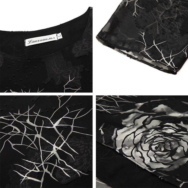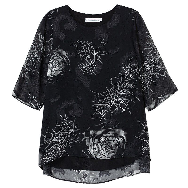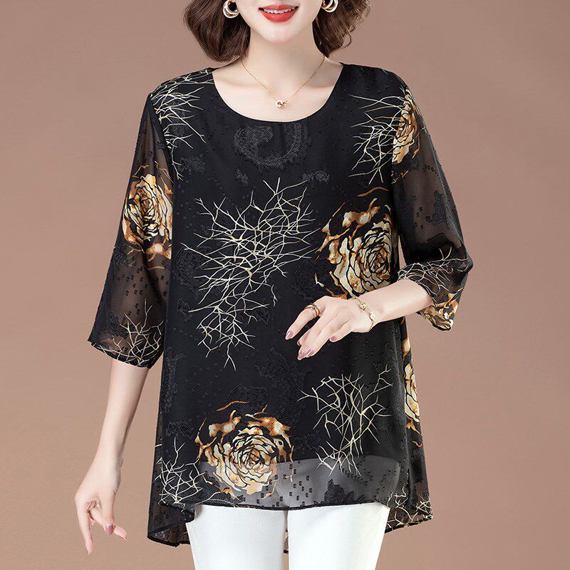 雪纺T恤女中长款碎花中袖加肥加大码中年妈妈春秋小衫七分袖上衣