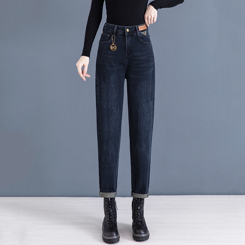啄木鸟宽松牛仔裤女春秋高腰显瘦哈伦裤时尚百搭黑色直筒老爹裤