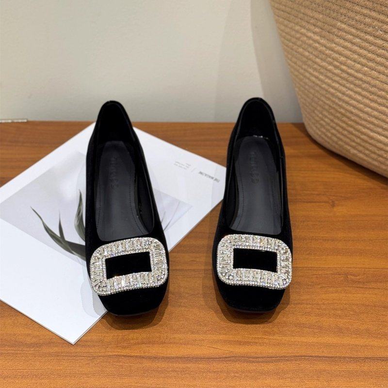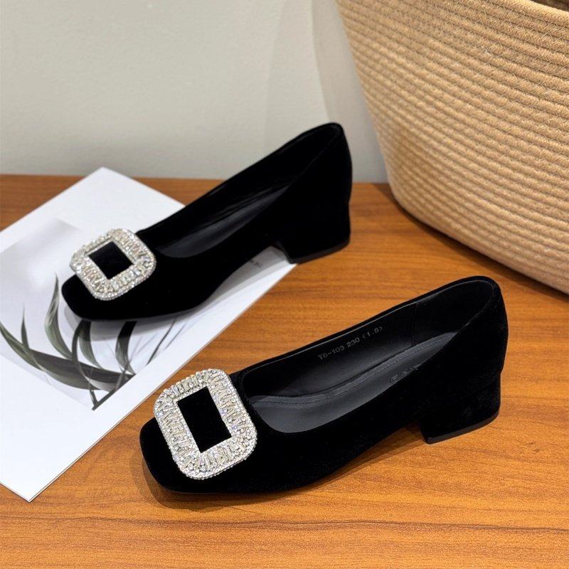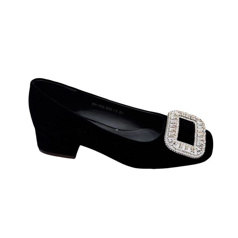 法式粗跟洋气水钻高跟鞋女2026新款时尚中跟方头浅口绒面百搭单鞋