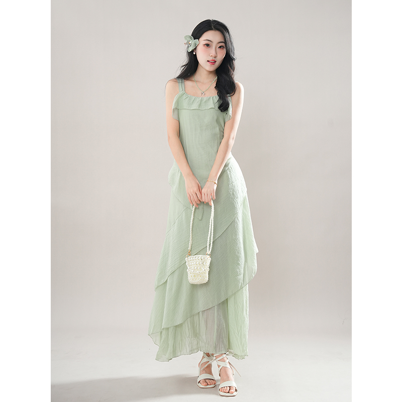 法式度假风收腰裙2025夏季高级感不规则荷叶边下摆连衣裙撞色长裙