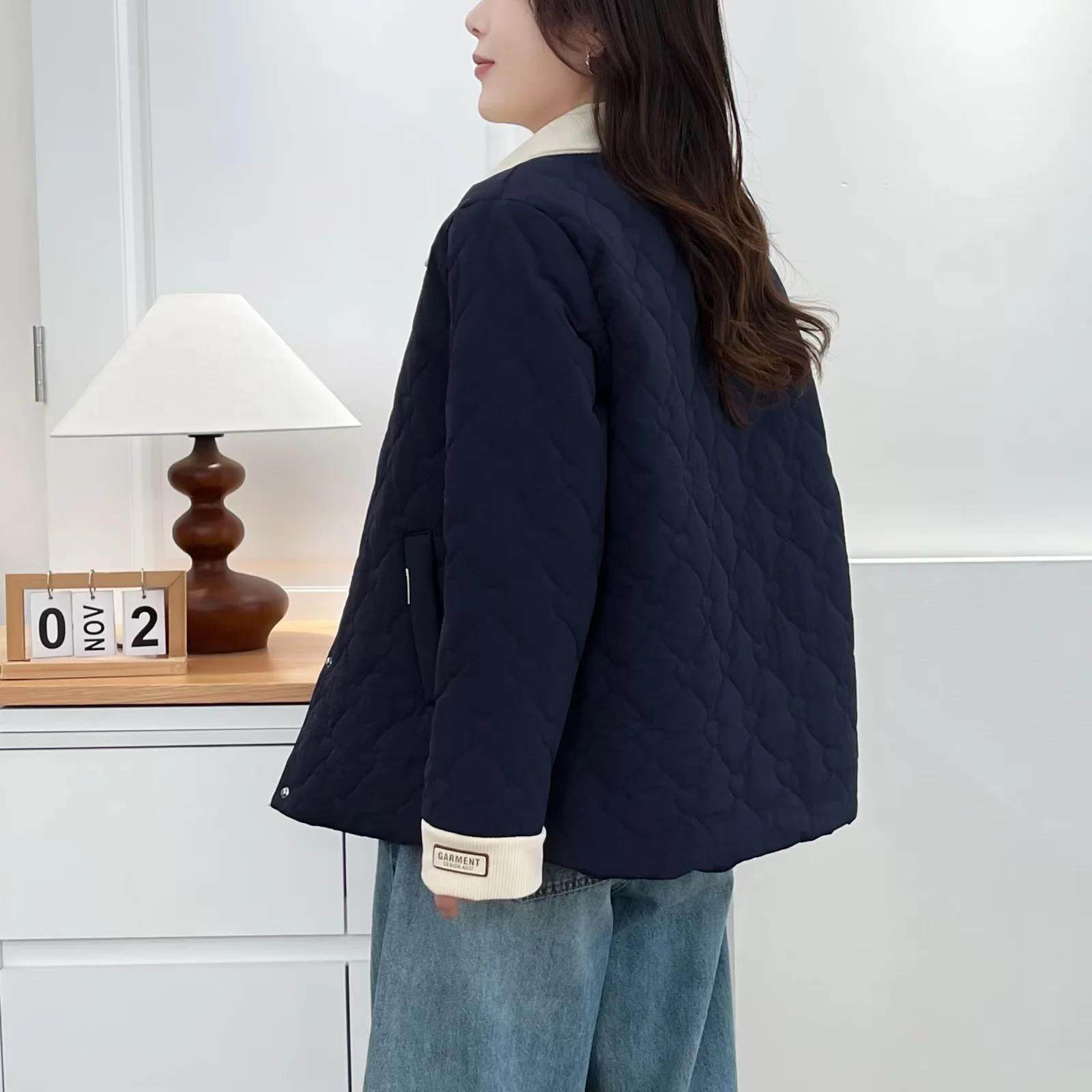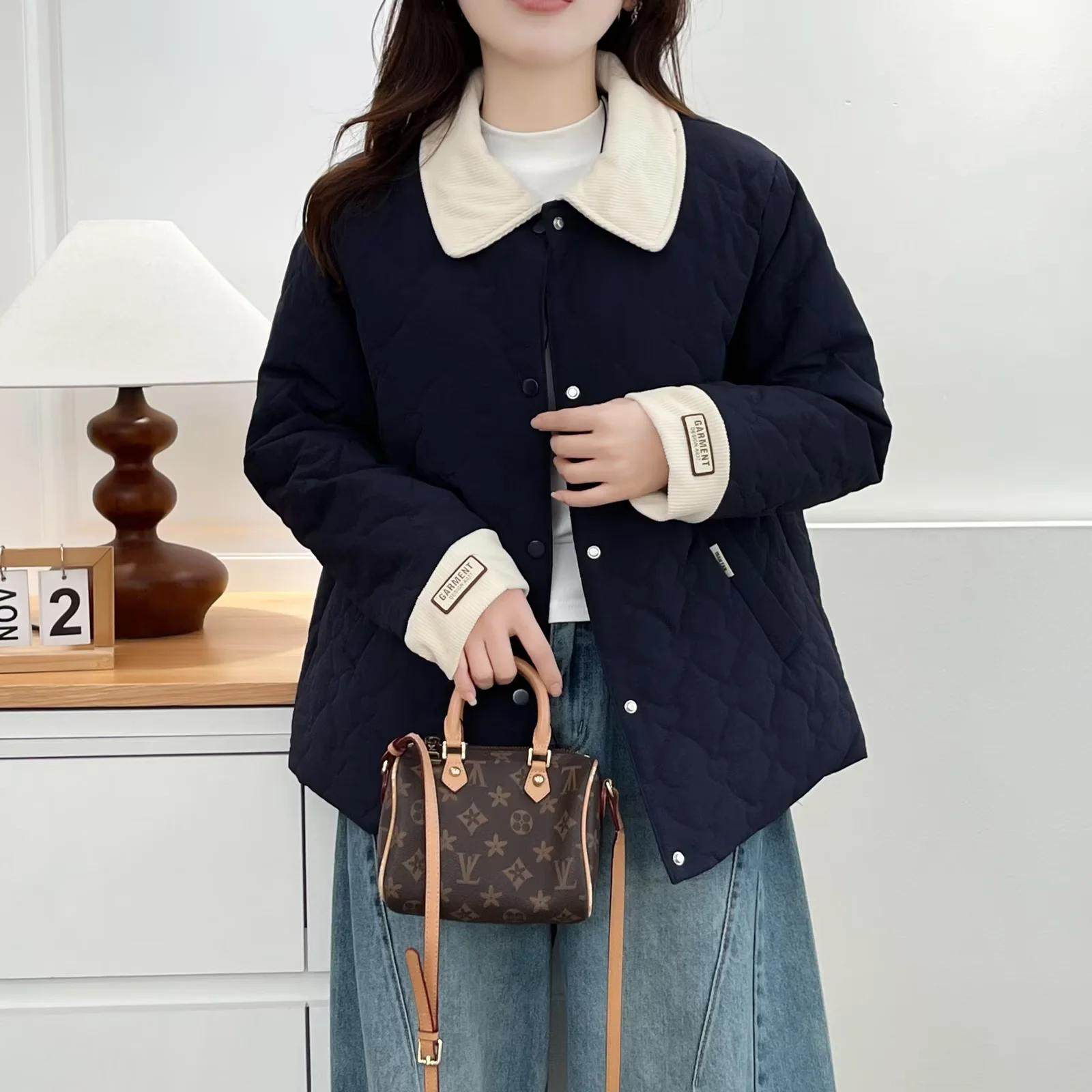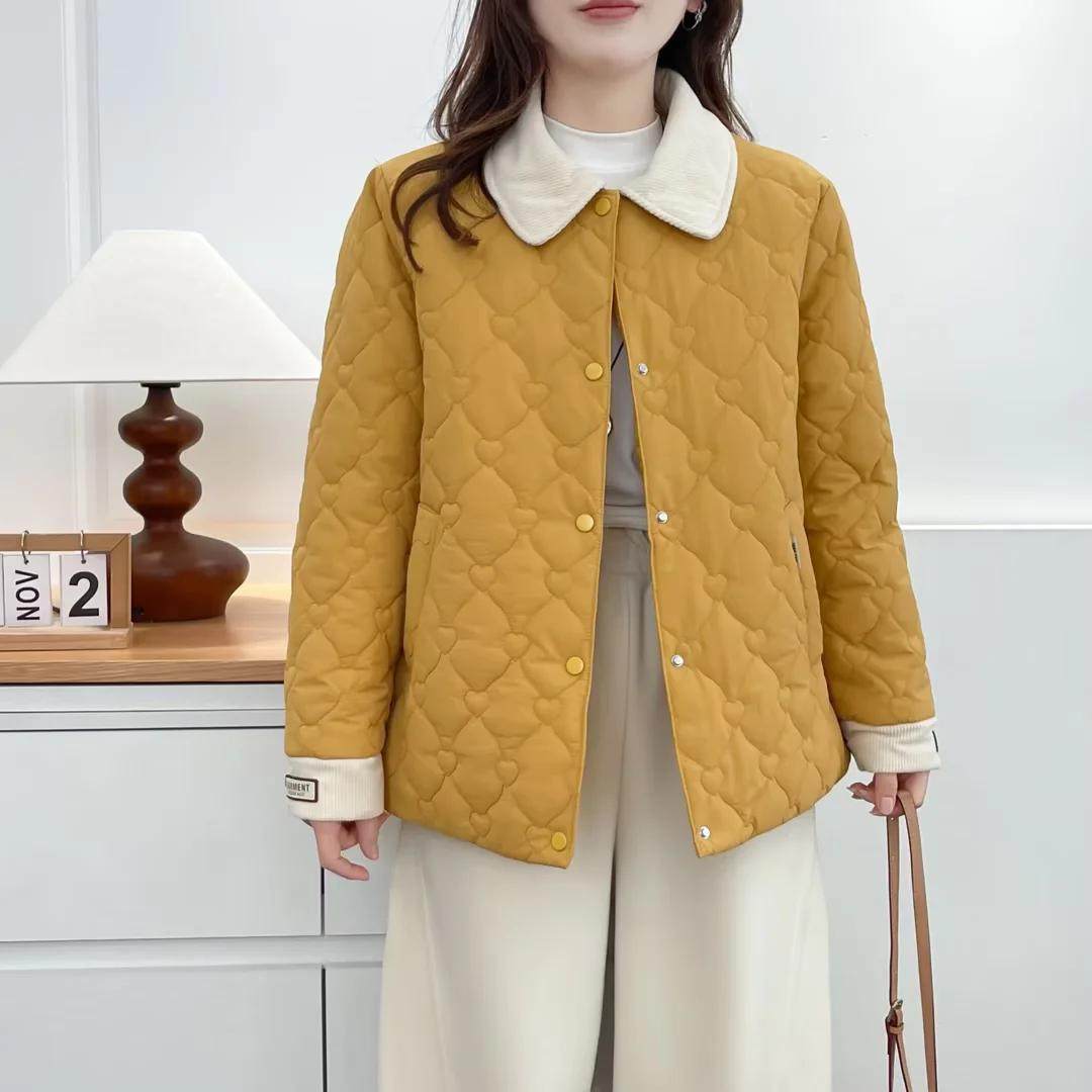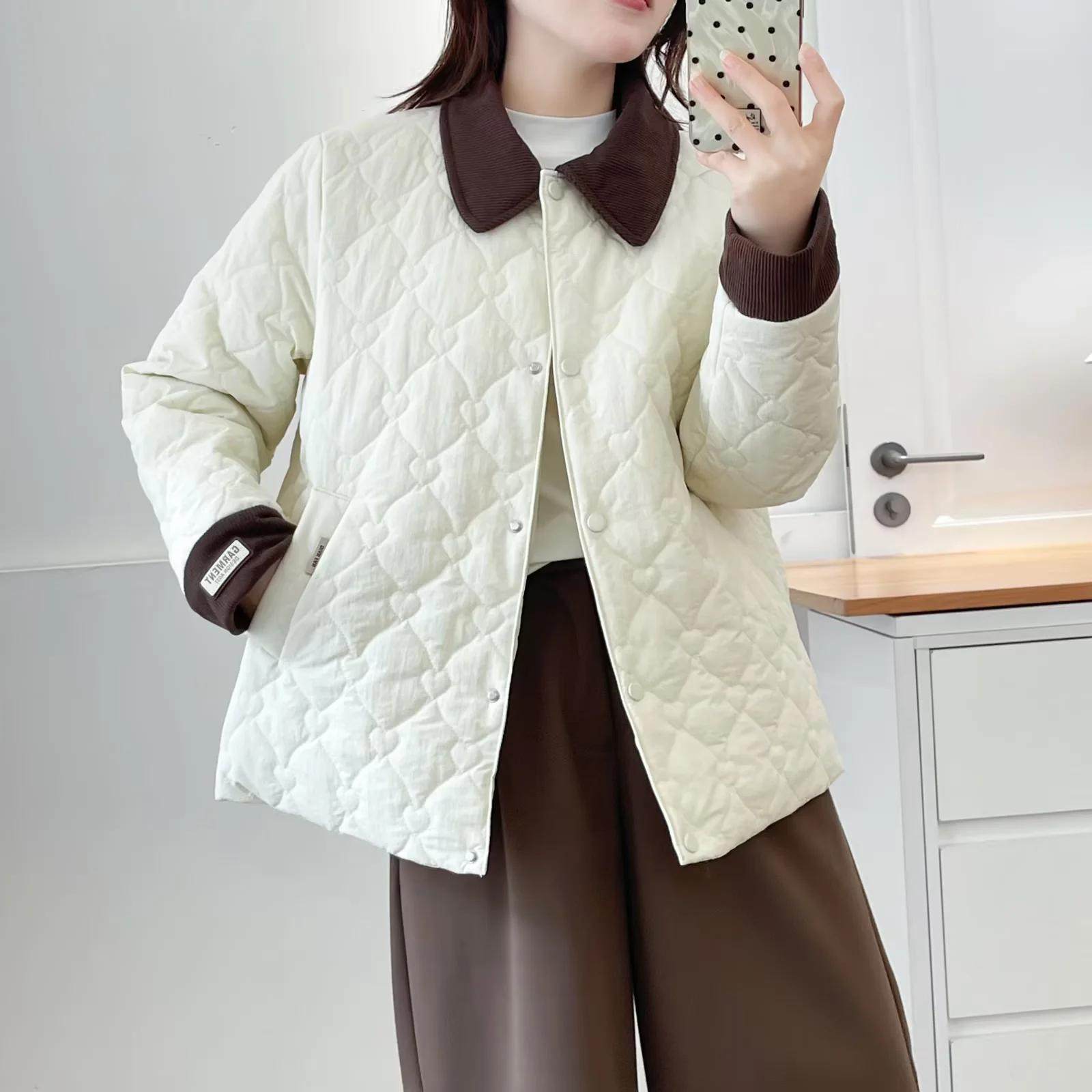 2025冬装胖mm女装菱格小爱心女棉袄拼色大码翻领加厚贴标中年棉服