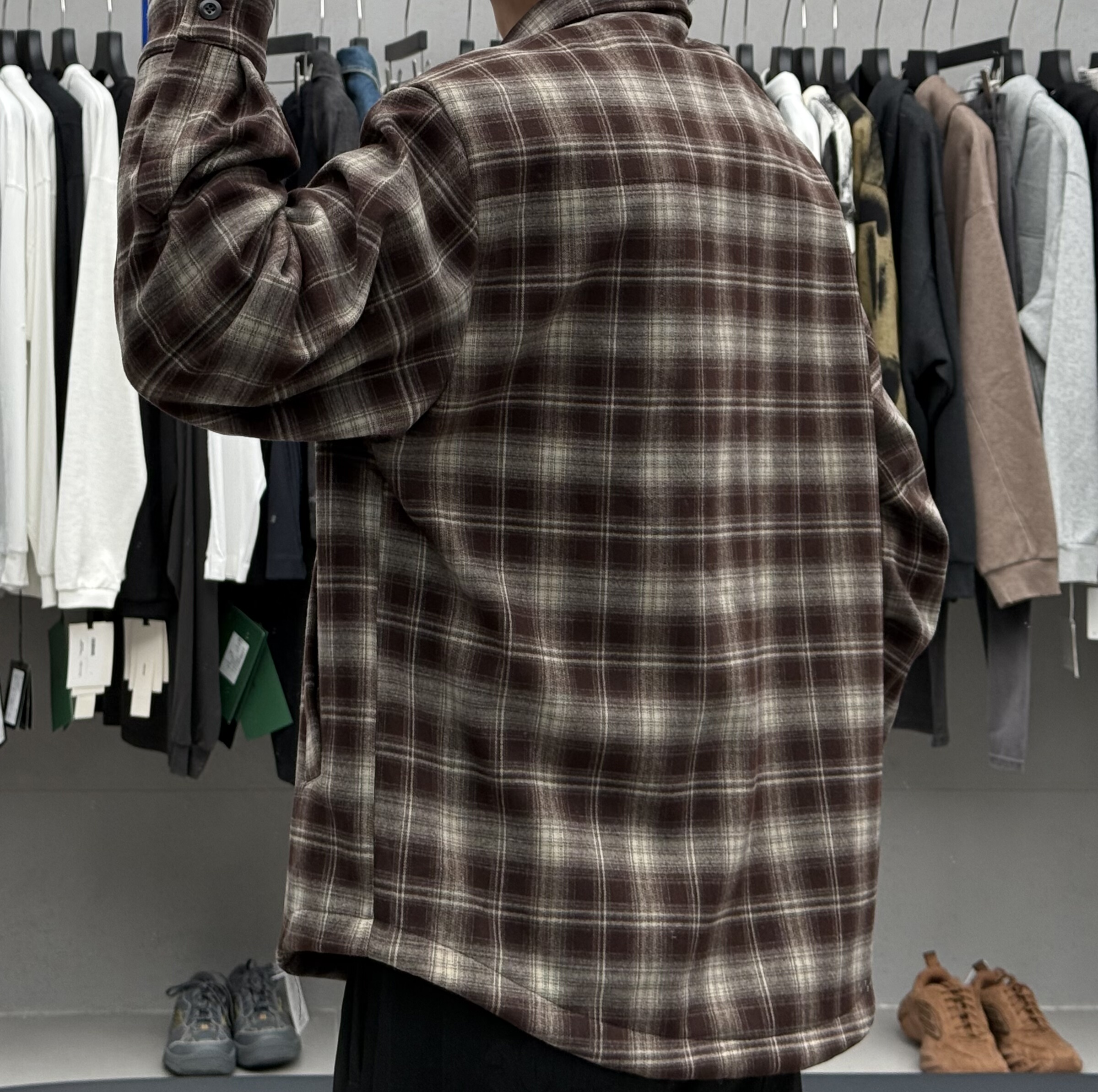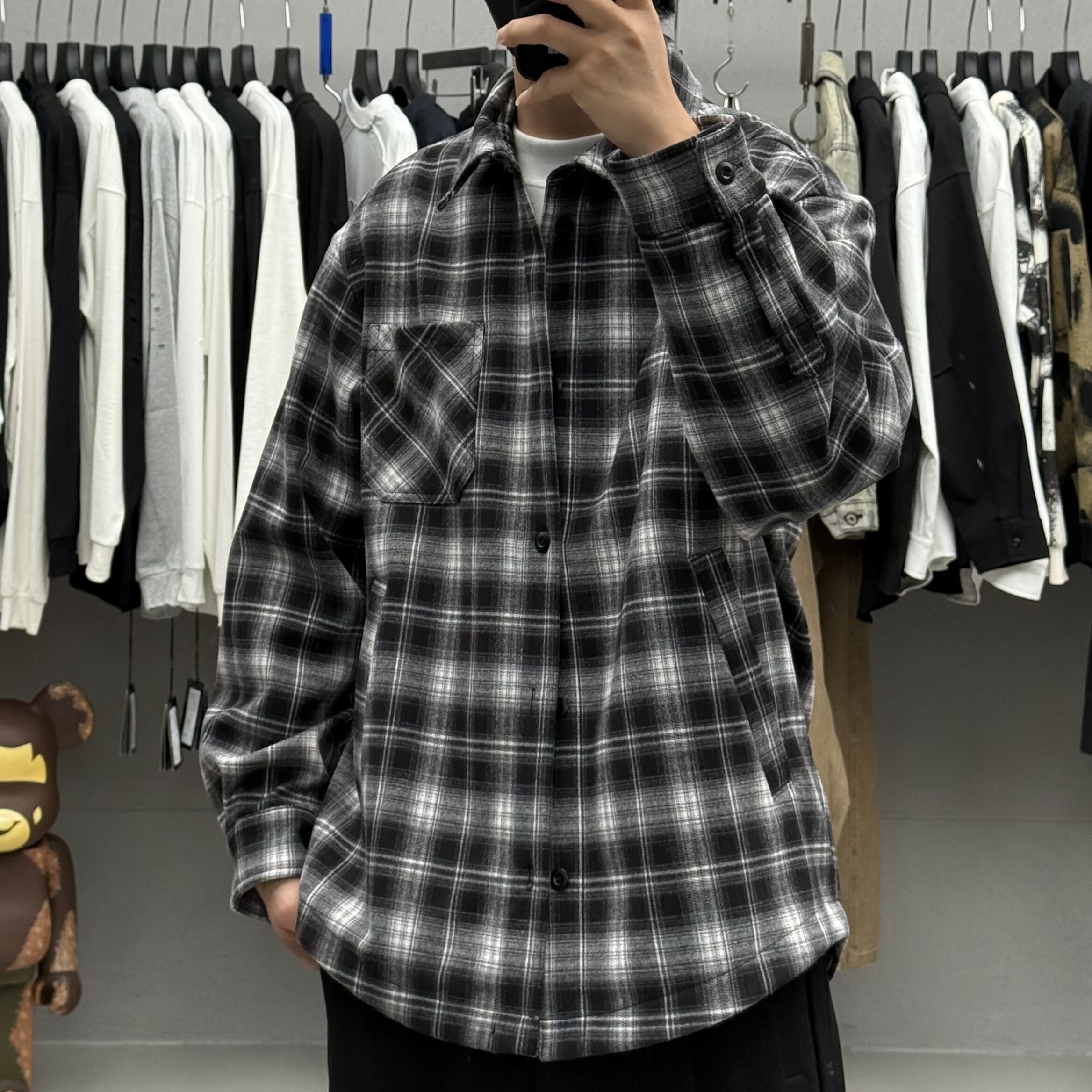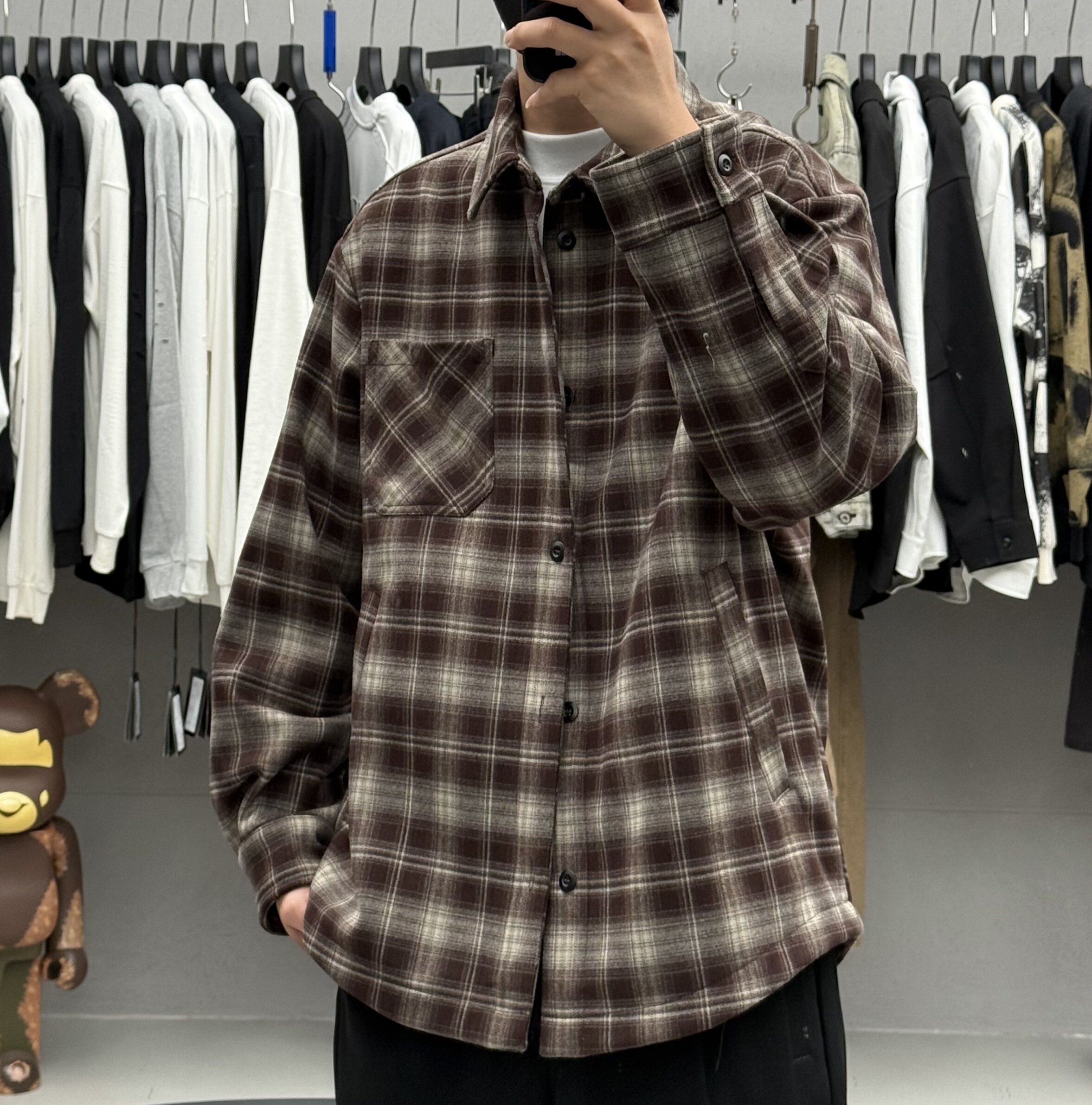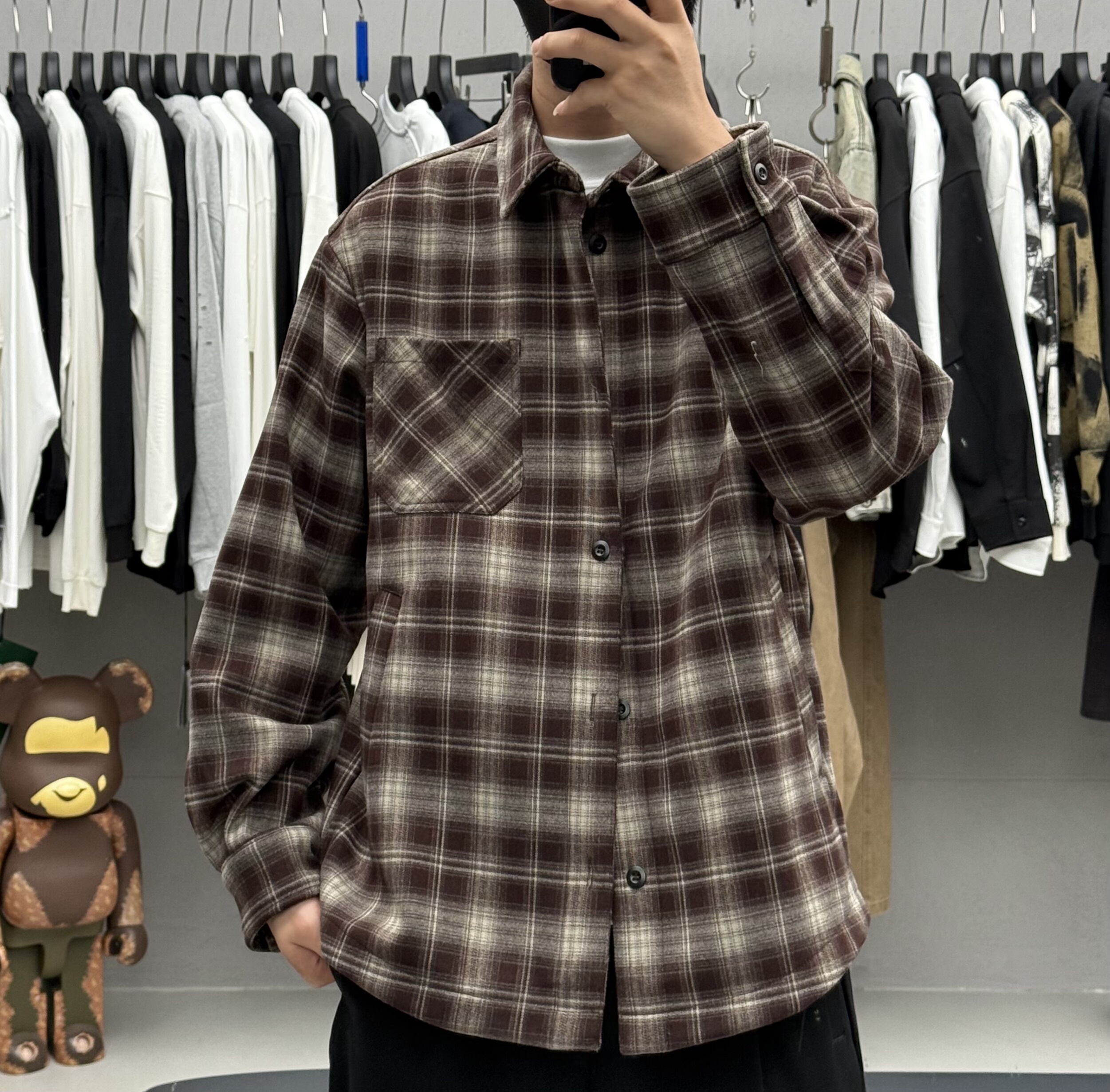 美式复古撞色加绒格子衬衫外套男秋冬高级感休闲翻领工装保暖外套