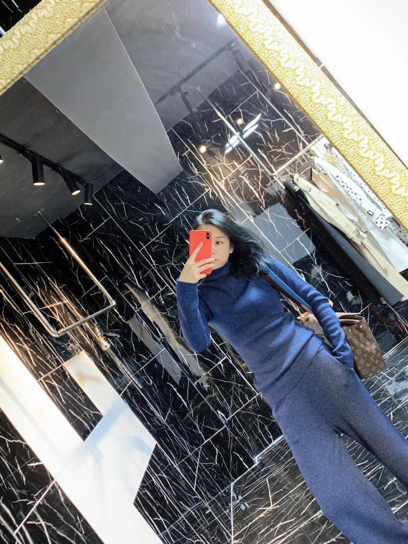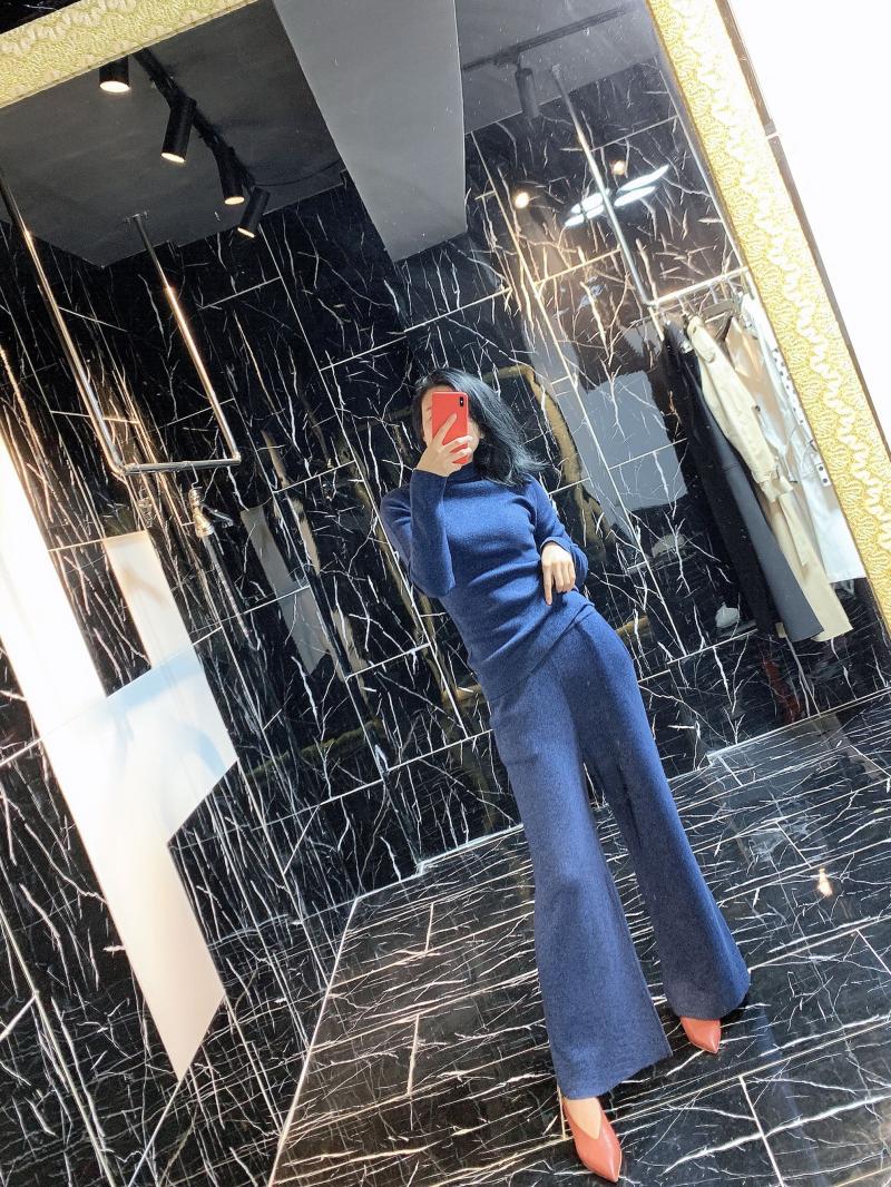 蓝色两穿简约亲肤柔顺羊毛毛衣长裤针织套装女春秋两件套