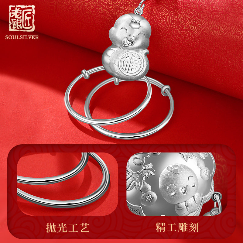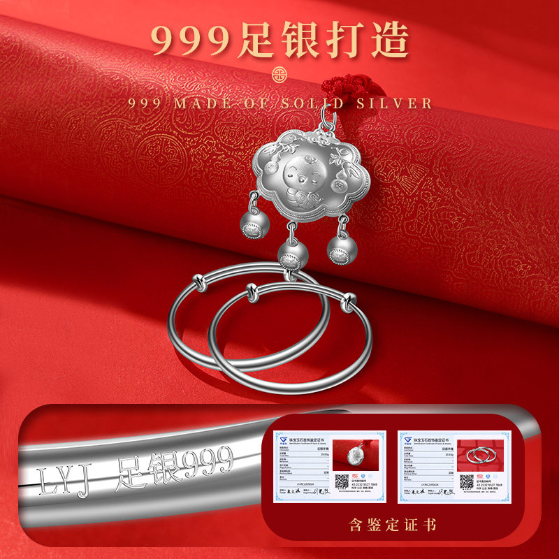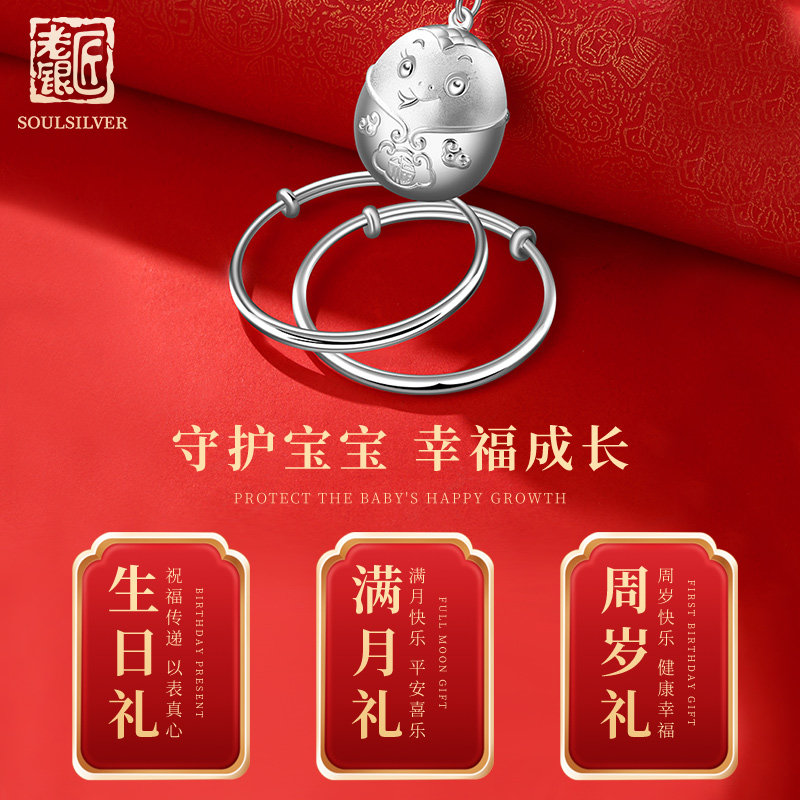 老银匠蛇年宝宝纯银手镯s999足银长命锁新生儿婴儿满月礼银镯银锁