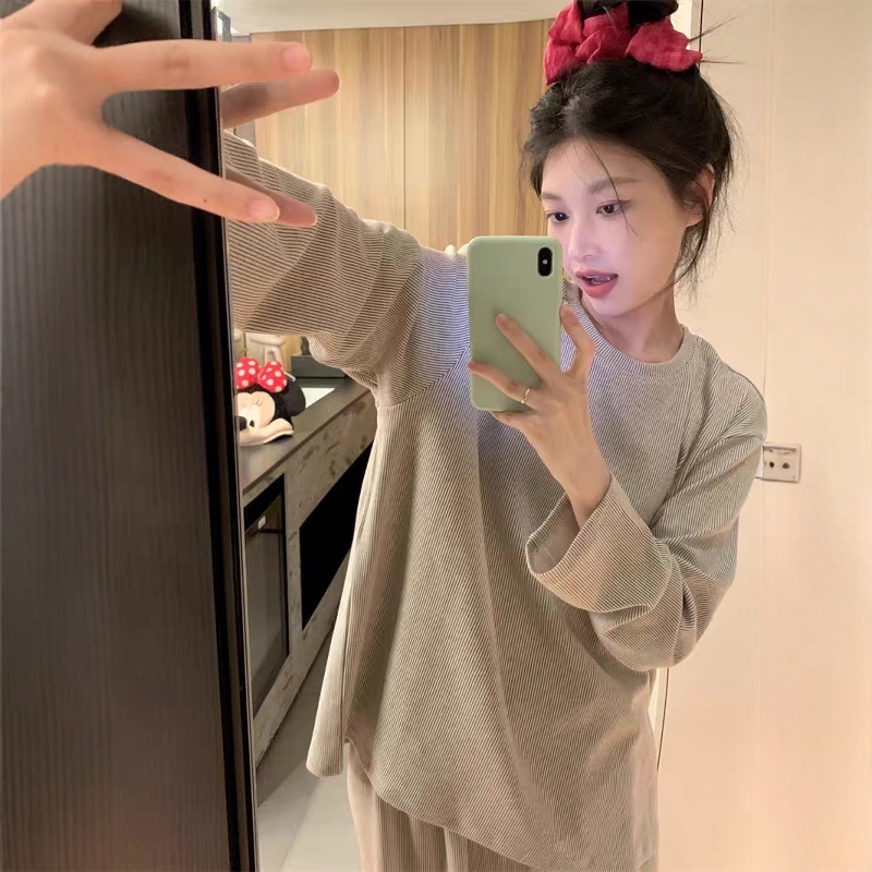 韩版棕色条纹睡衣女春秋款2025新款宽松简约长袖长裤家居服两件套