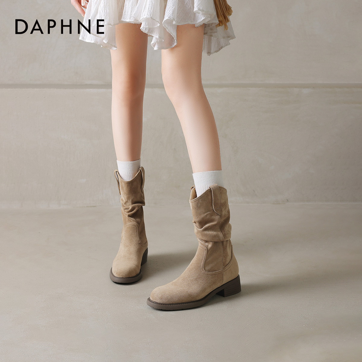 达芙妮复古中筒靴绒面堆堆靴骑士